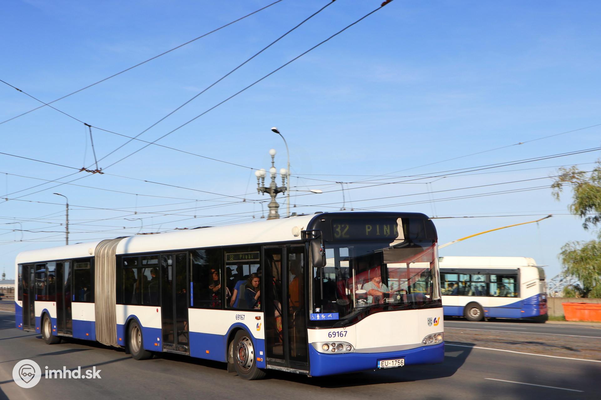 Solaris Urbino 18 II #69167 prechádza po Kamennom moste na západný breh rieky Daugava.