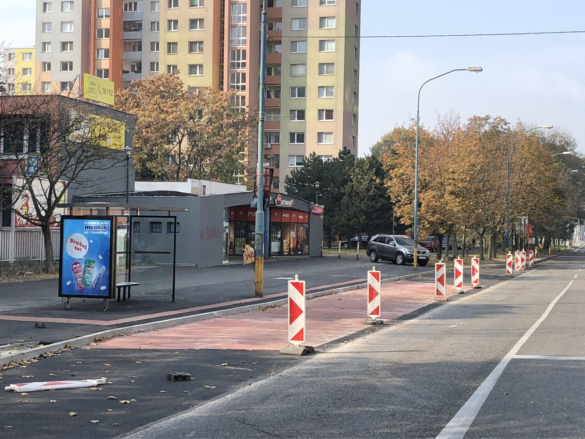 Pod lampou je najväčšia tma... Zrekonštruovaný povrch zastávky Mlynarovičova je už pred sprevádzkovaním zastávky využívaný ako parkovisko. Zastávka Mlynarovičova, 19. 10. 2018.
