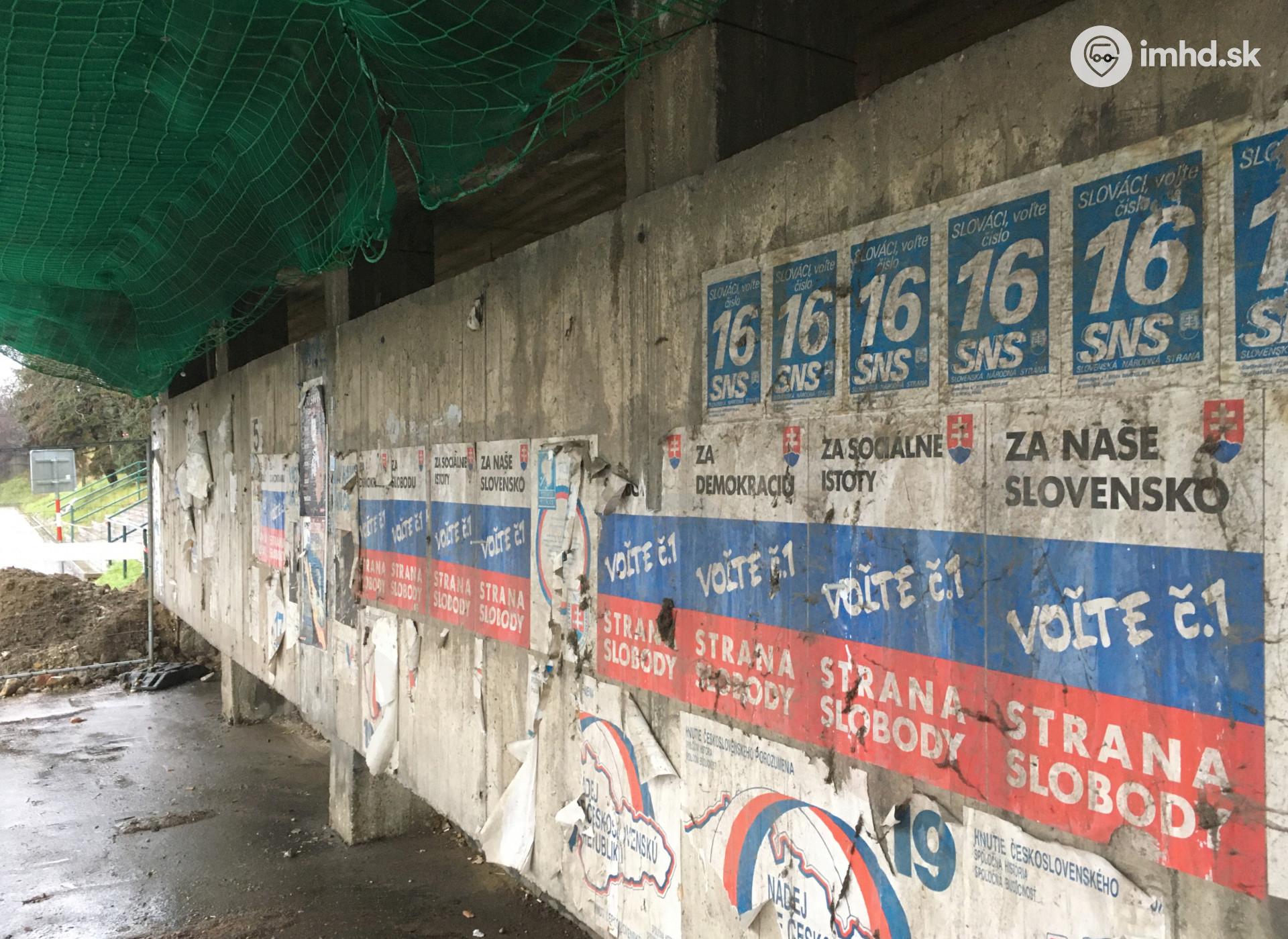 Predvolebné plagáty z roku 1990 na stene opravovaného prístrešku. Plagáty boli 33 rokov prekryté dvojicou billboardov.
