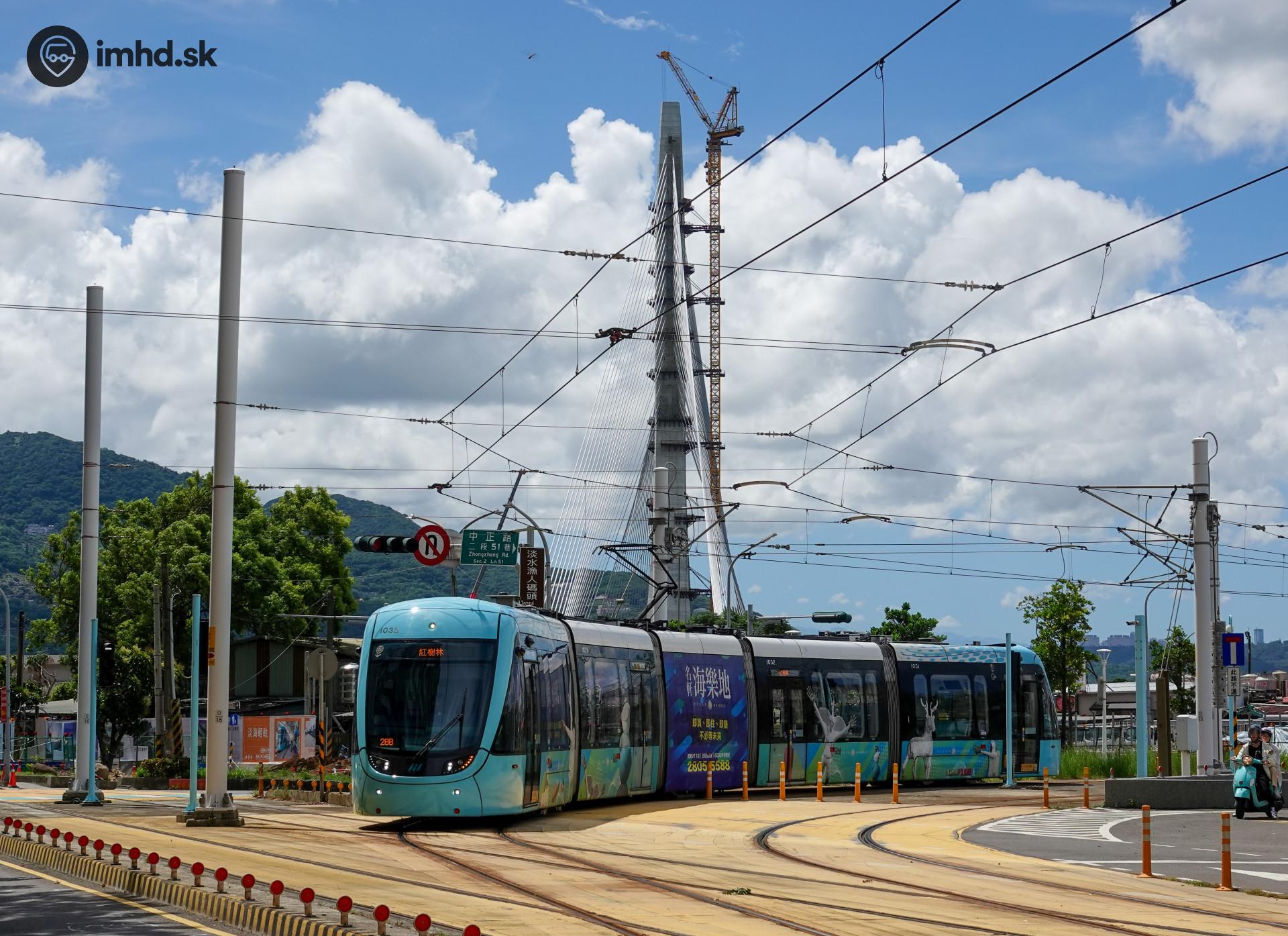 Električka na križovatke s ešte nepoužívanou vetvou a v pozadí mostom Danjiang vo výstavbe