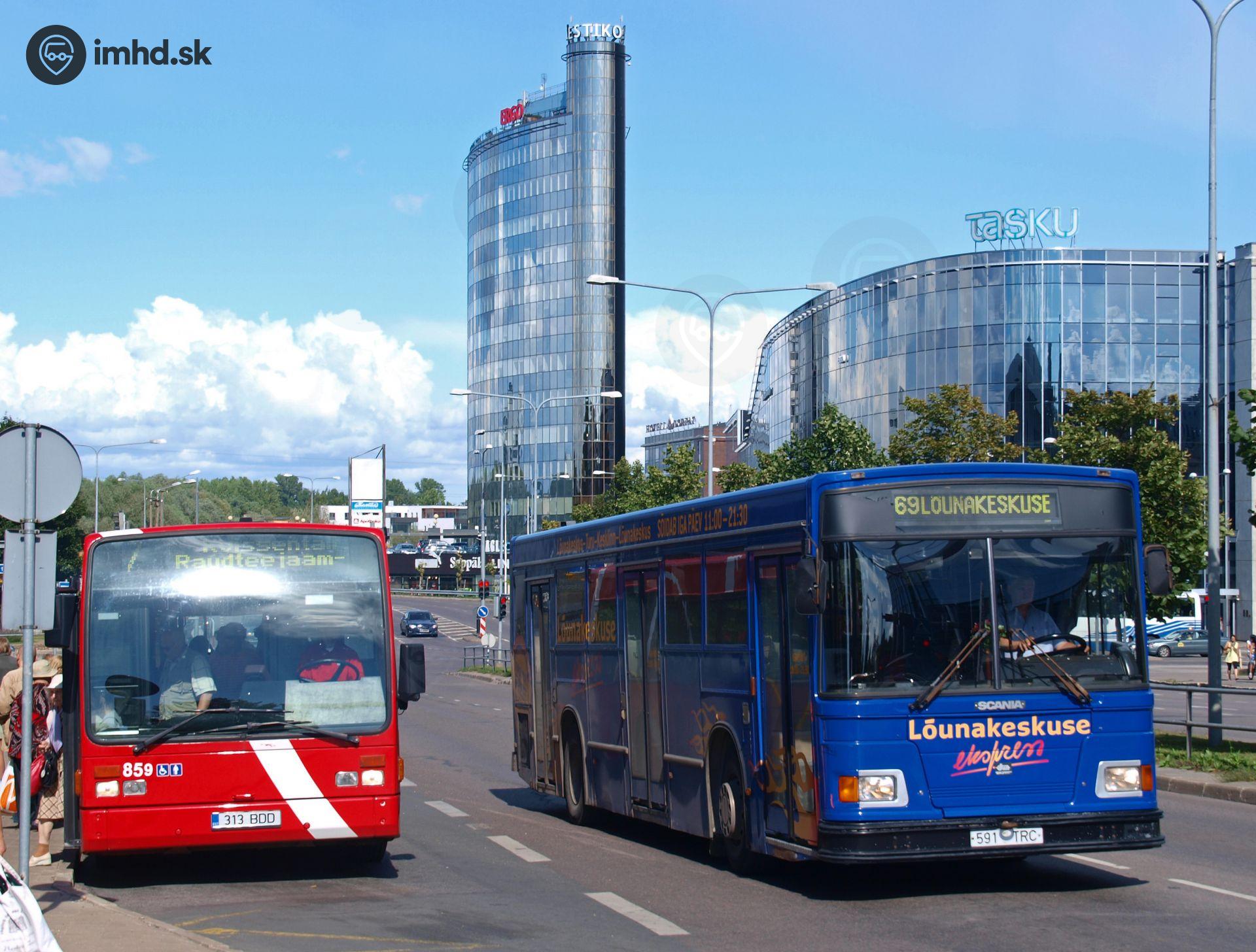 VanHool A300 #859 dopravcu AS Sebe, vpravo Scania L113CLB Duple Metsec T-56 City dopravcu GO Bus AS. V pozadí najvyššia veža v Turku a obchodné centrum Tasku.