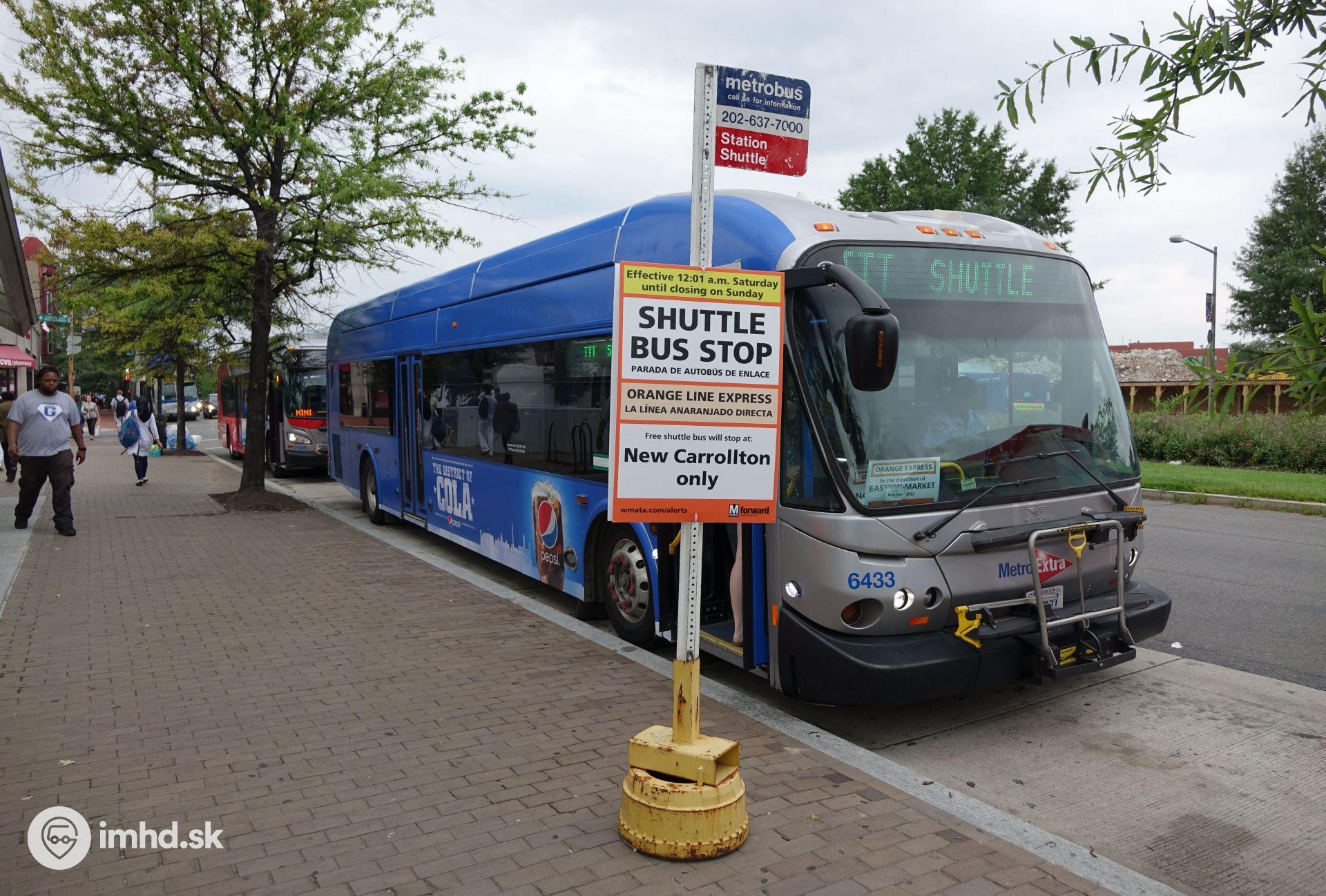 New Flyer DE40LFA na jasne označenej zastávke expresnej náhradnej dopravy za metro.