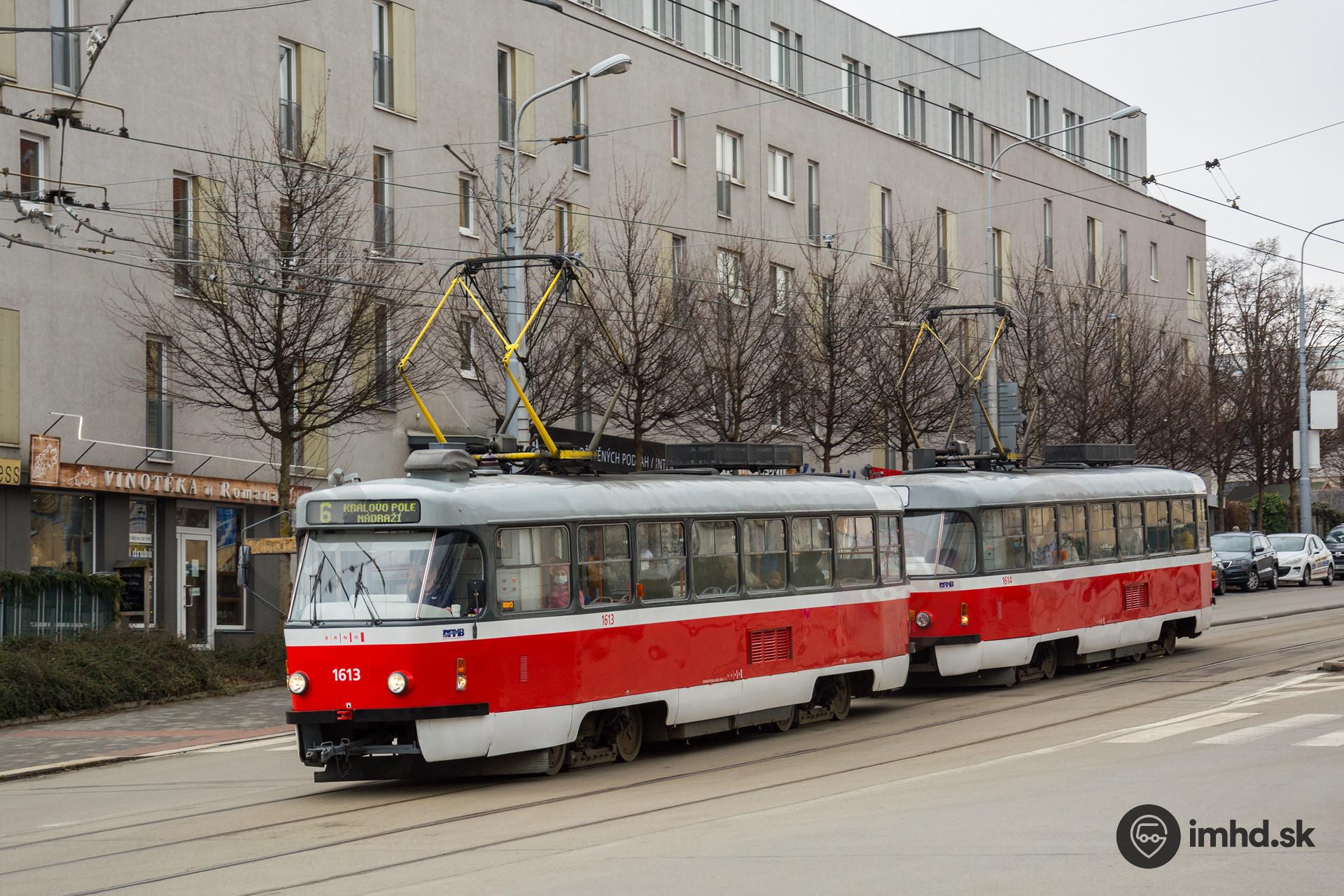 Súprava T3G #1613+#1614 klesá k železničnej stanici Brno-Královo Pole.