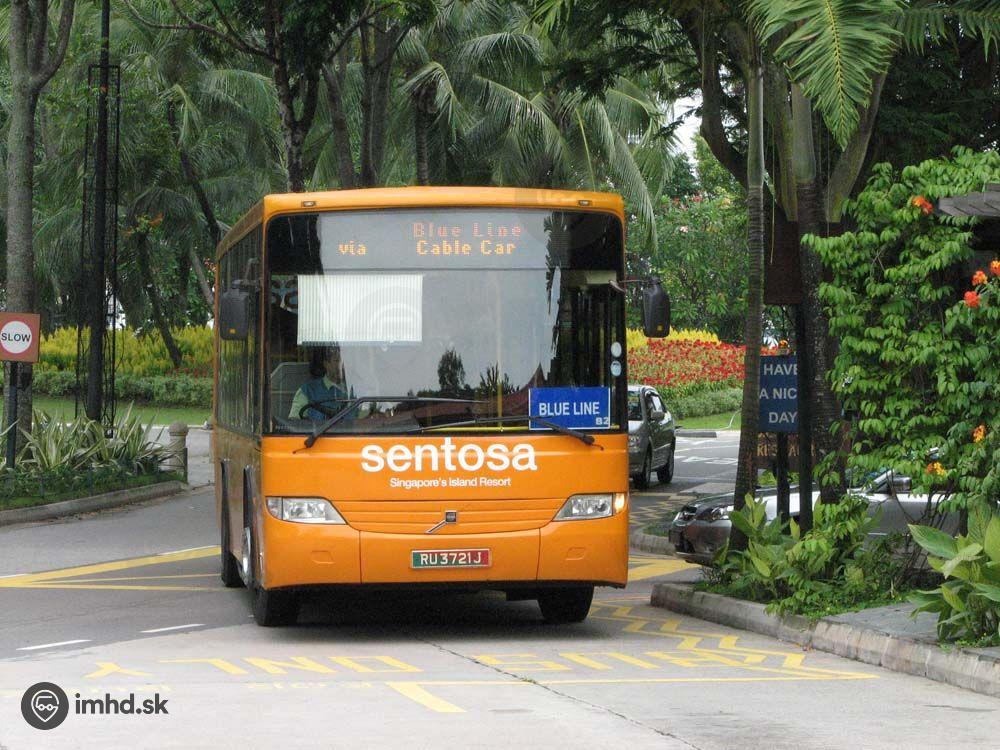 Modrá autobusová linka premávajúca v rámci zábavného ostrova Sentosa.