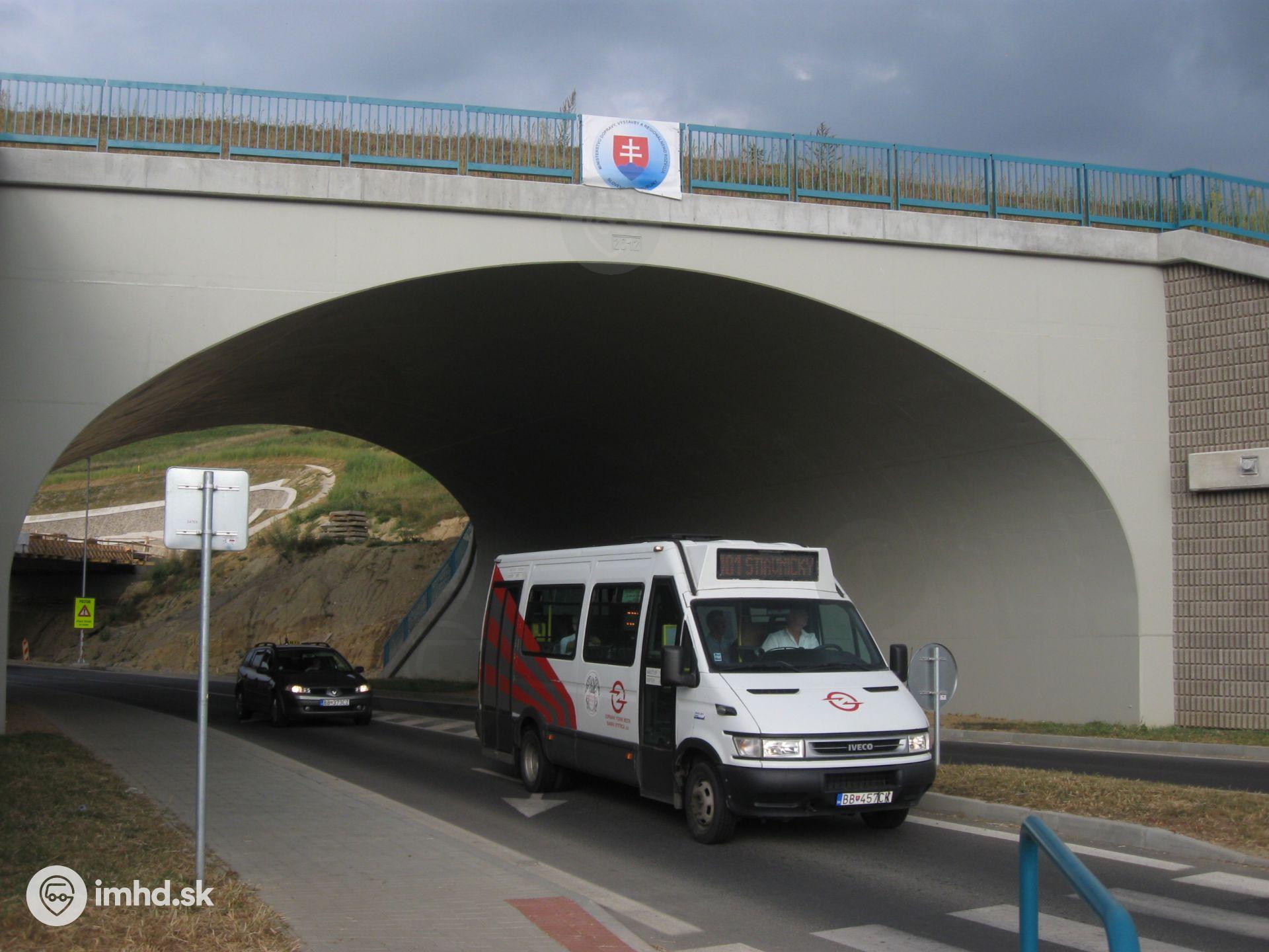 Minibus BB-457CK vychádza z novo postaveného podjazdu a prichádza na Cestu k nemocnici.