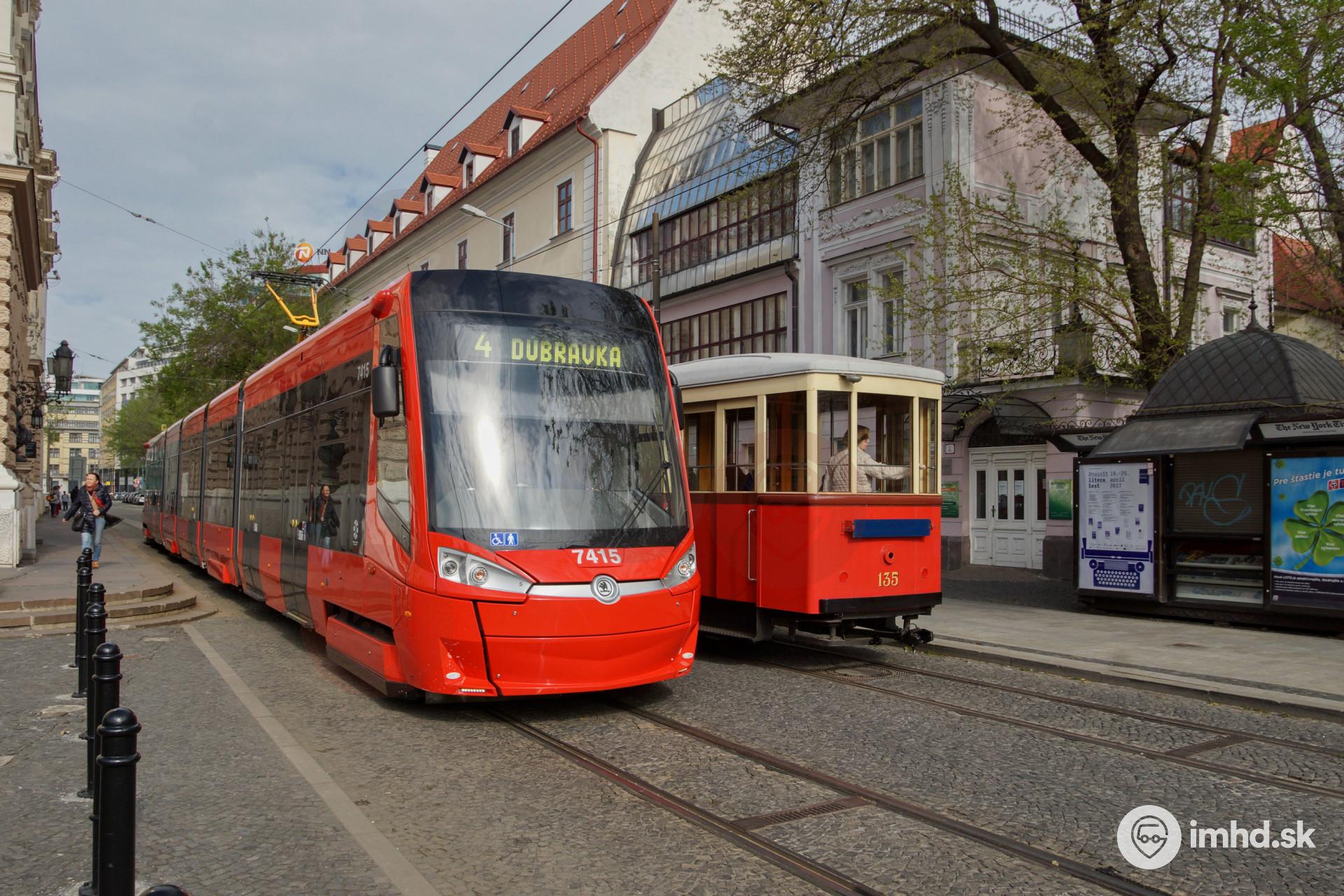 Stretnutie modernej nízkopodlažnej elektrčky Škoda 29T1 ForCity Plus #7415 a historickej súpravy BMEŽ "Päťokeňák" #31 s vlečným vozňom SGP #135 na Jesenského. | |