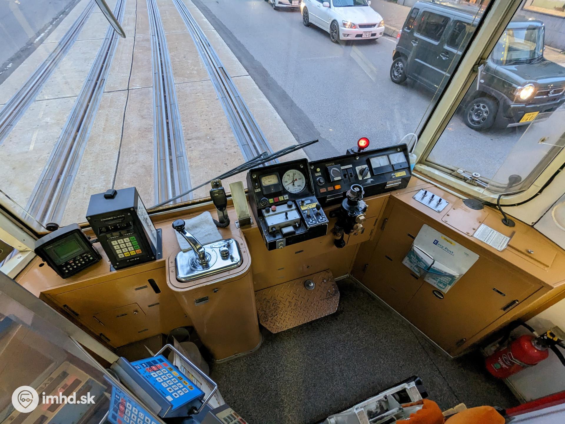 Pracovisko vodiča s veľkým červeným svetlom signalizujúcim otvorené dvere.