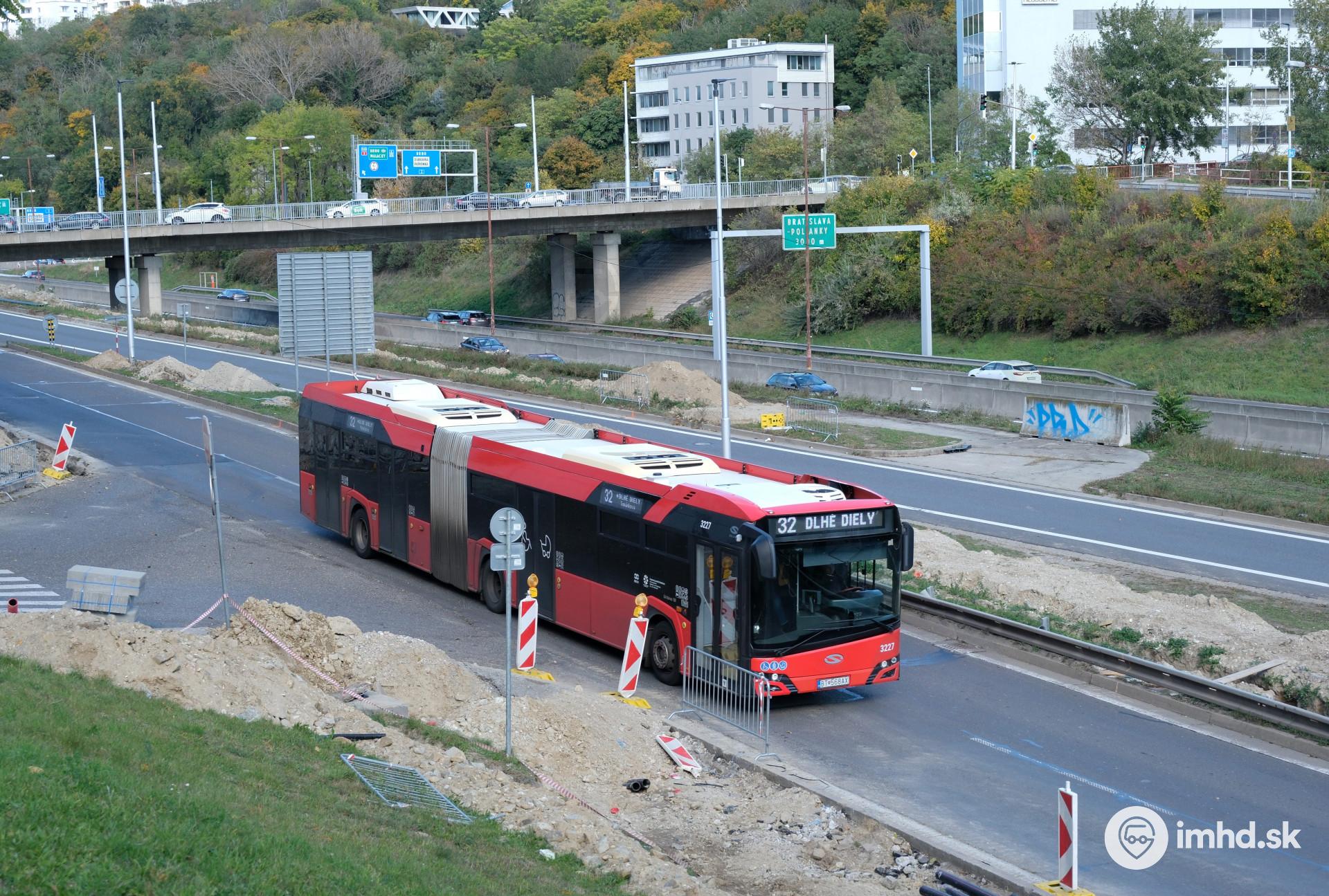 #3227 prechádza rozkopanou Mlynskou dolinou počas výstavby trolejbusovej trate