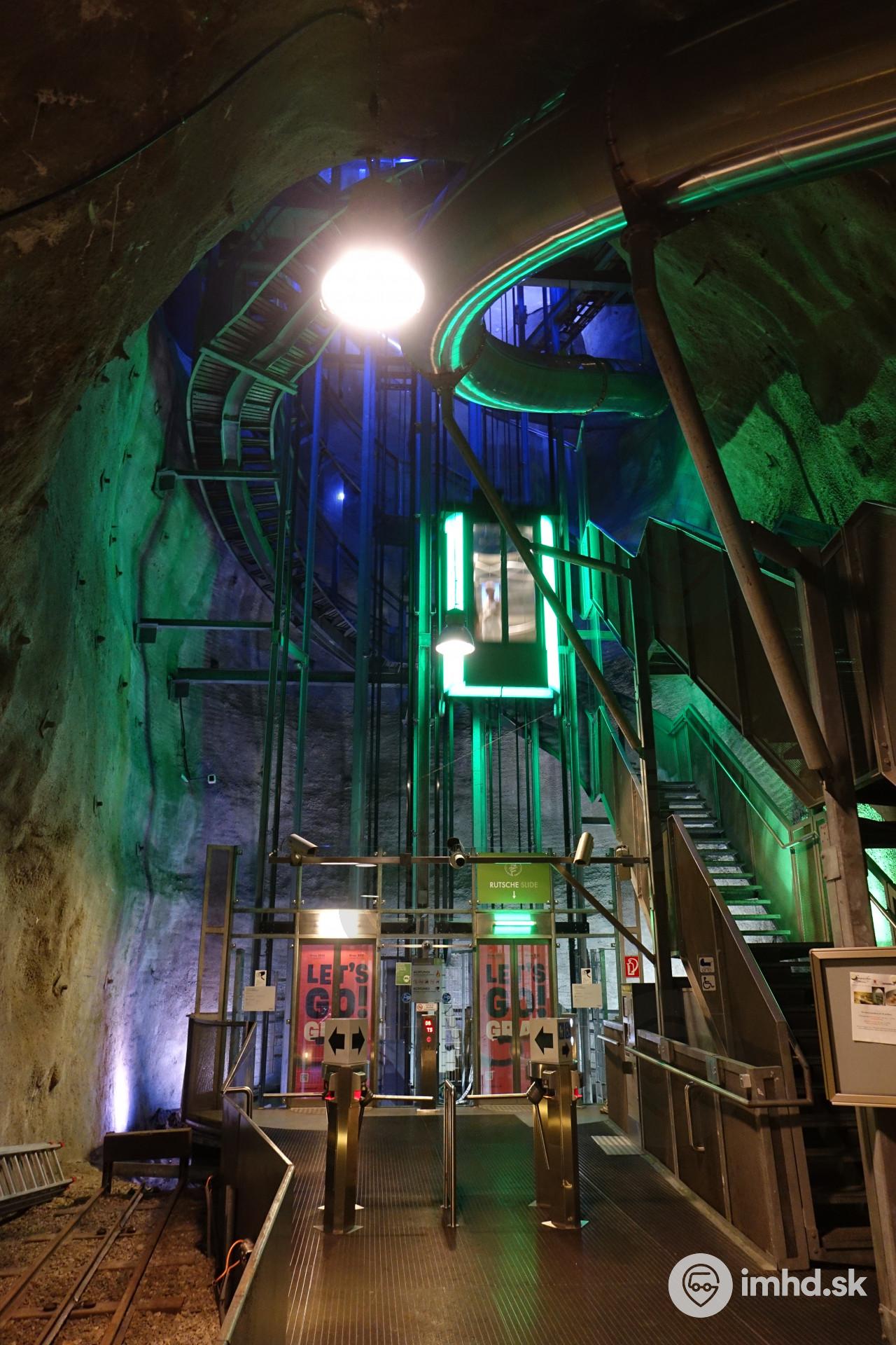 Výťahy na Schlossberg, z ktorého sa dá dole dostať napríklad aj najväčšou podzemnou šmykľavkou na svete