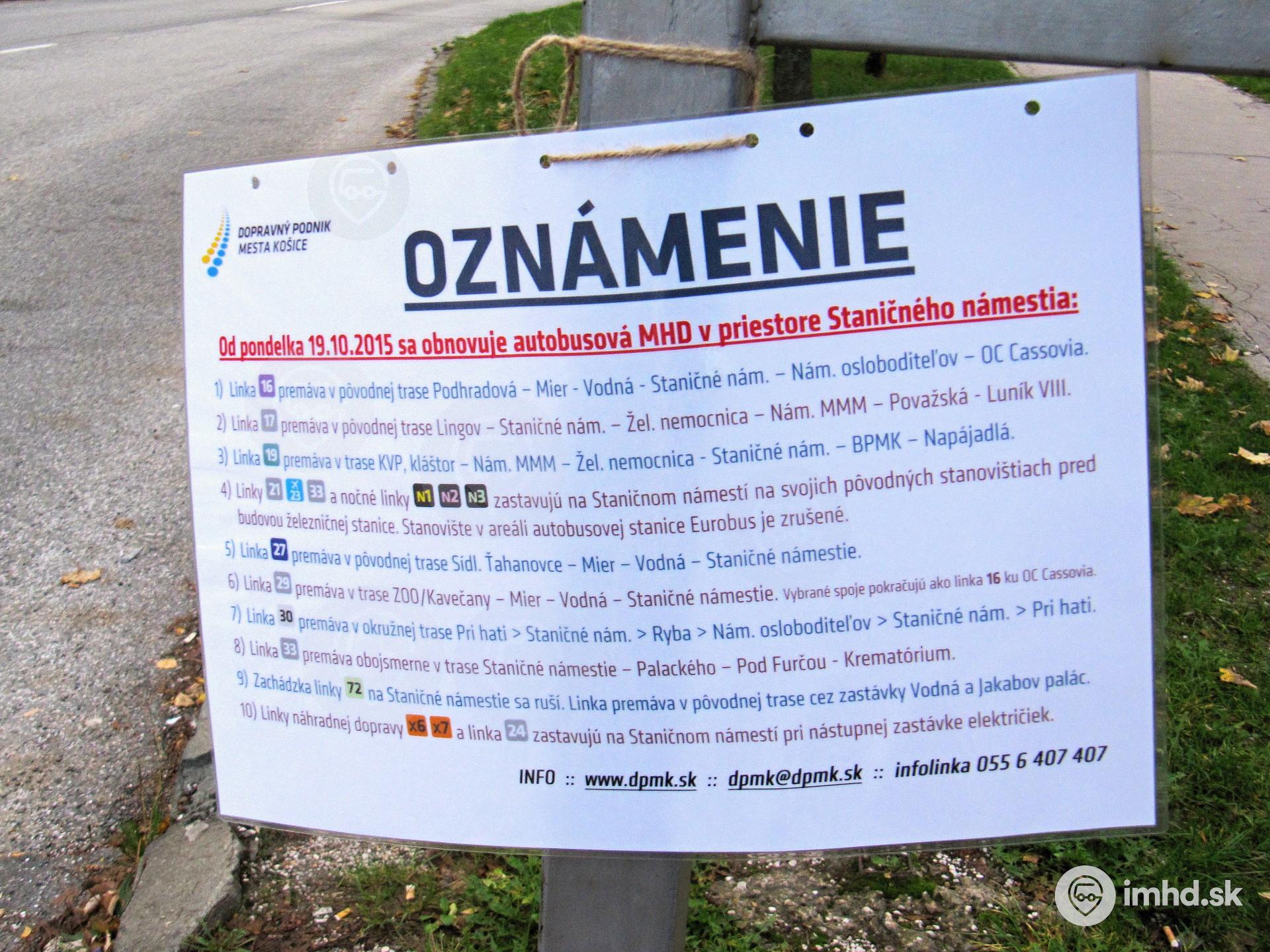 Oznam o spustení premávky autobusových liniek na Staničnom námestí.