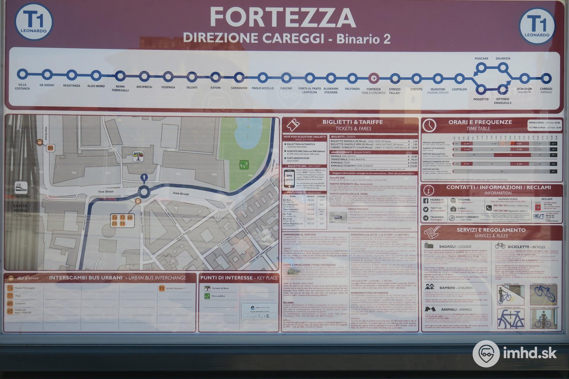 Schéma linky T1 a informácie pre cestujúcich na zastávke Fortezza.