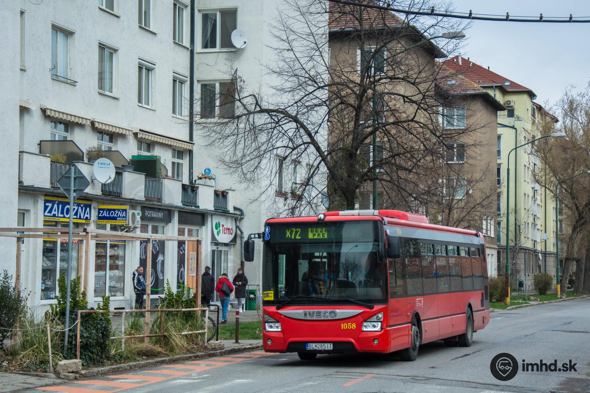 Iveco Urbanway 12M #1058 zachytený na obchádzkovej trase cez Páričkovu ulicu v čase, keď linka X72 premávala zadarmo.