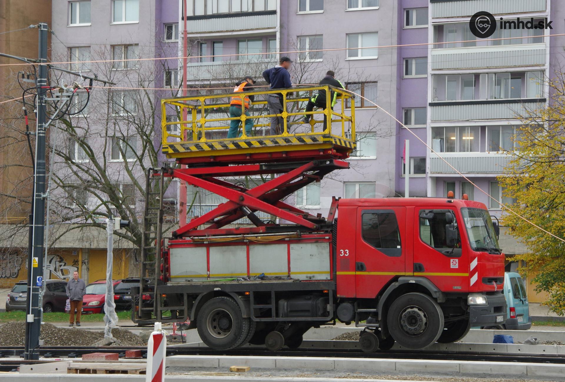 | Trolejová veža DPB vypomáha pri montáži trolejového vedenia. | |
