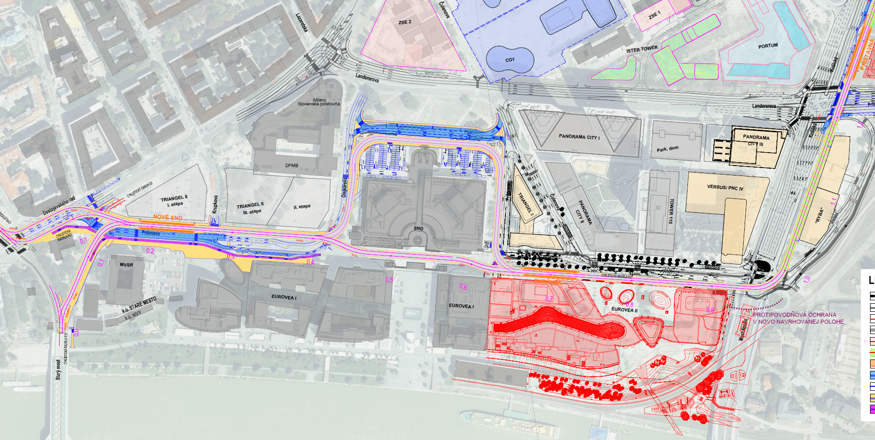 Navrhované vedenie trate v úseku Šafárikovo nám. - Prístavná.