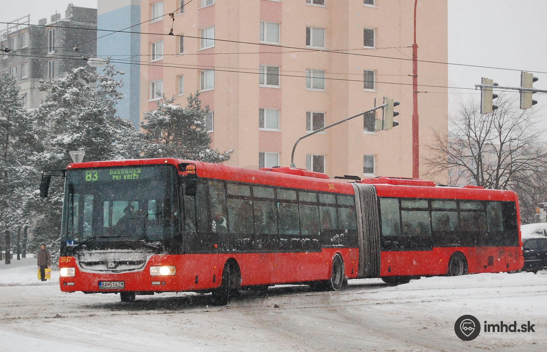#2847 pomaly odbočuje do starej Dúbravky za hustého sneženia.