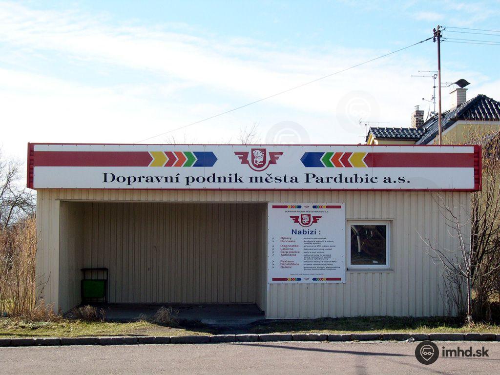 Zastávkový prístrešok a sociálne zariadenie pre vodičov s reklamou na služby miestneho dopravcu DPMP na konečnej Jesničánky, točna.