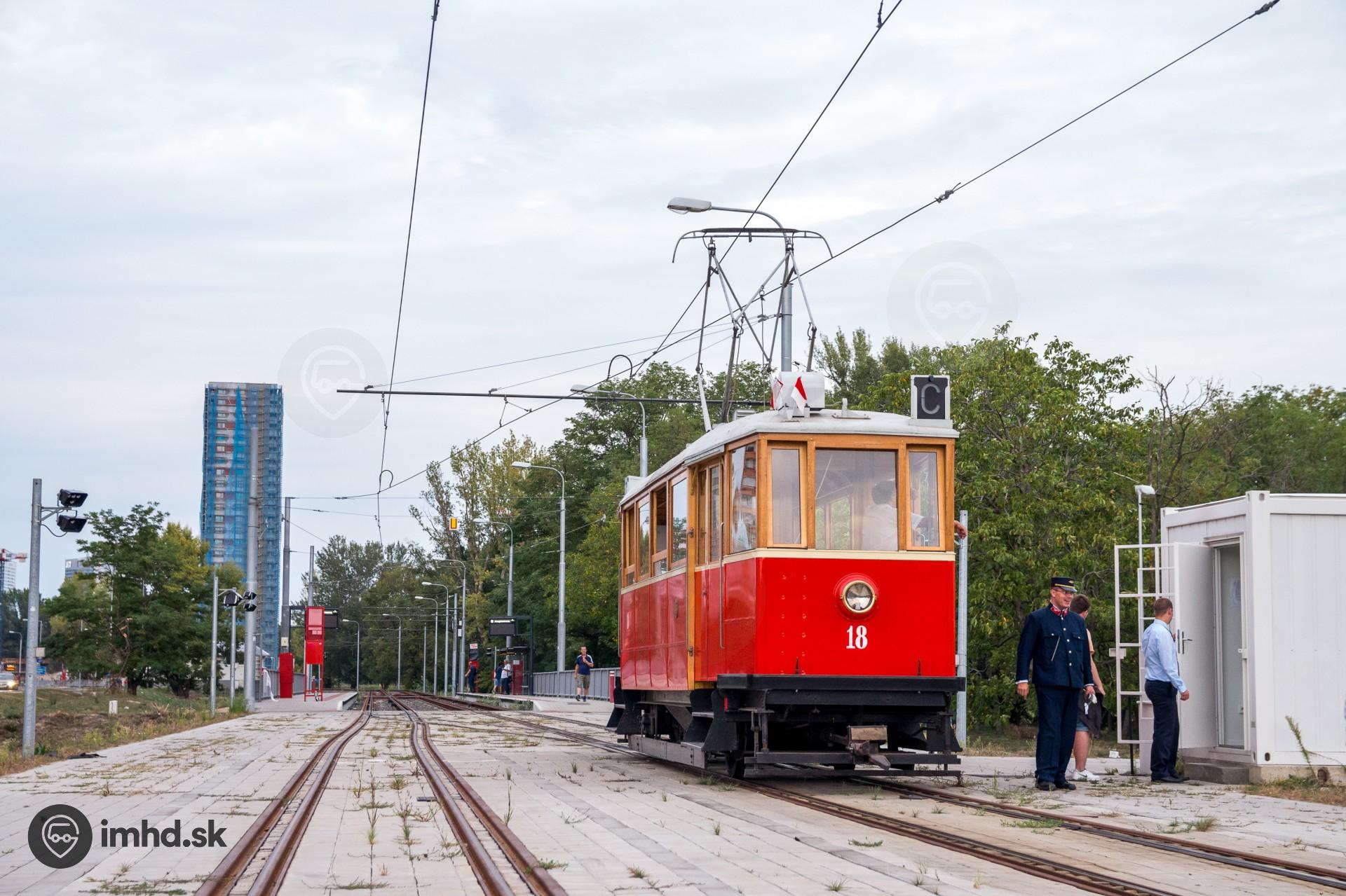 Prestávkujúca historická električka na obratisku Jungmannova