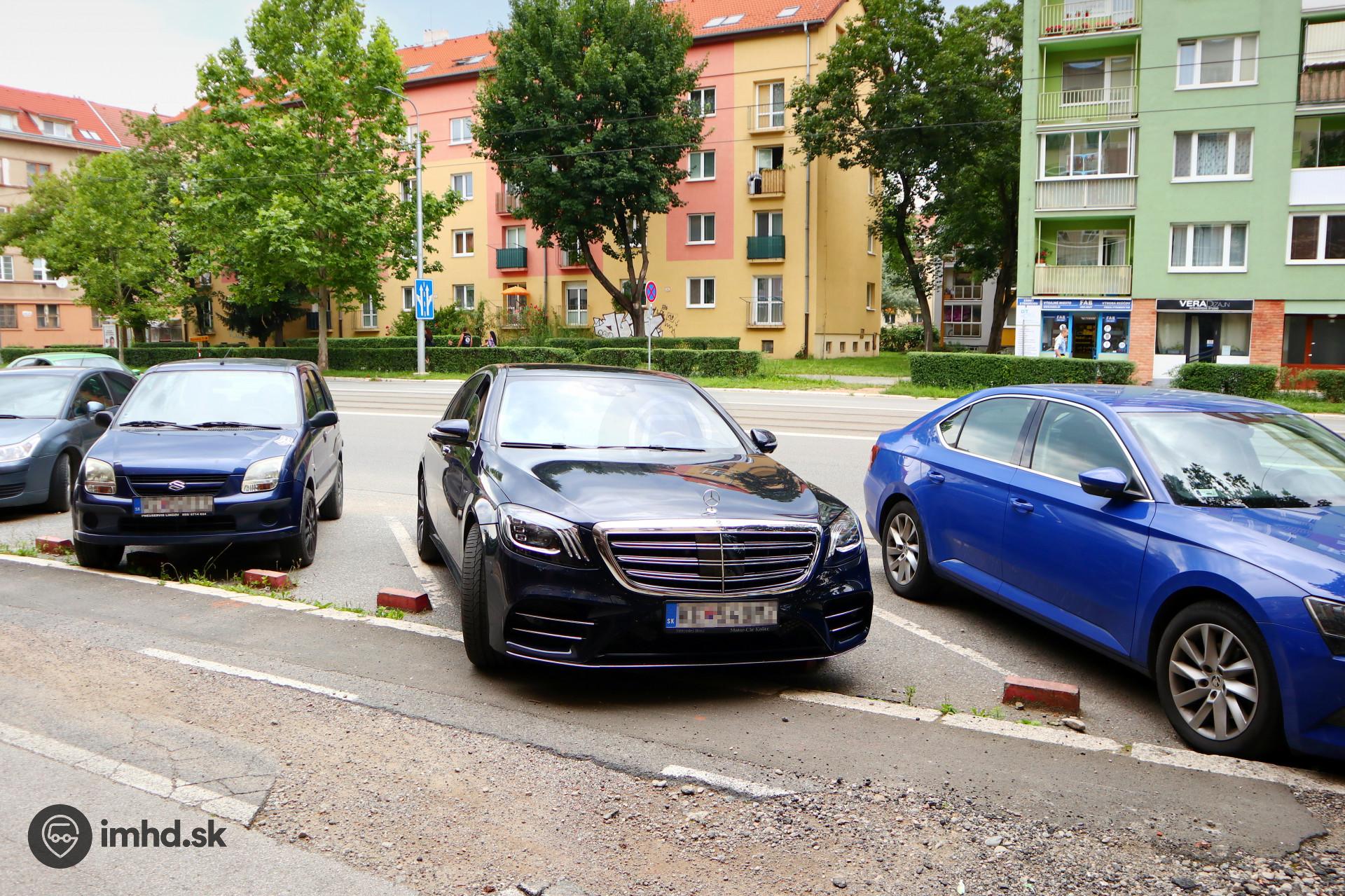 Šikmé parkovacie miesta pred cukrárňou na Komenského ulici sú v tesnej blízkosti cyklochodníka
