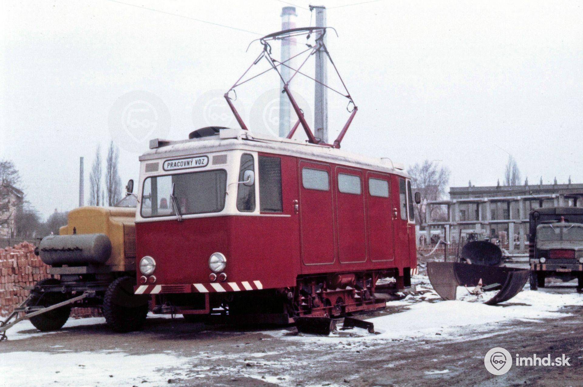 Nový brúsiaci voz Schörling v bývalej vozovni na Martanovičovej ulici. V pozadí prebieha výstavba nového sídla dopravného podniku.