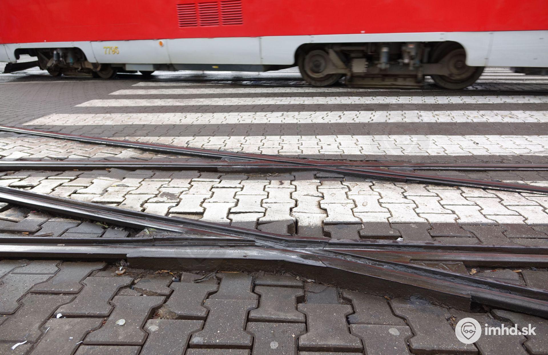 Vyčnievajúca prasknutá koľajová križovatka uprostred priechodu pre chodcov