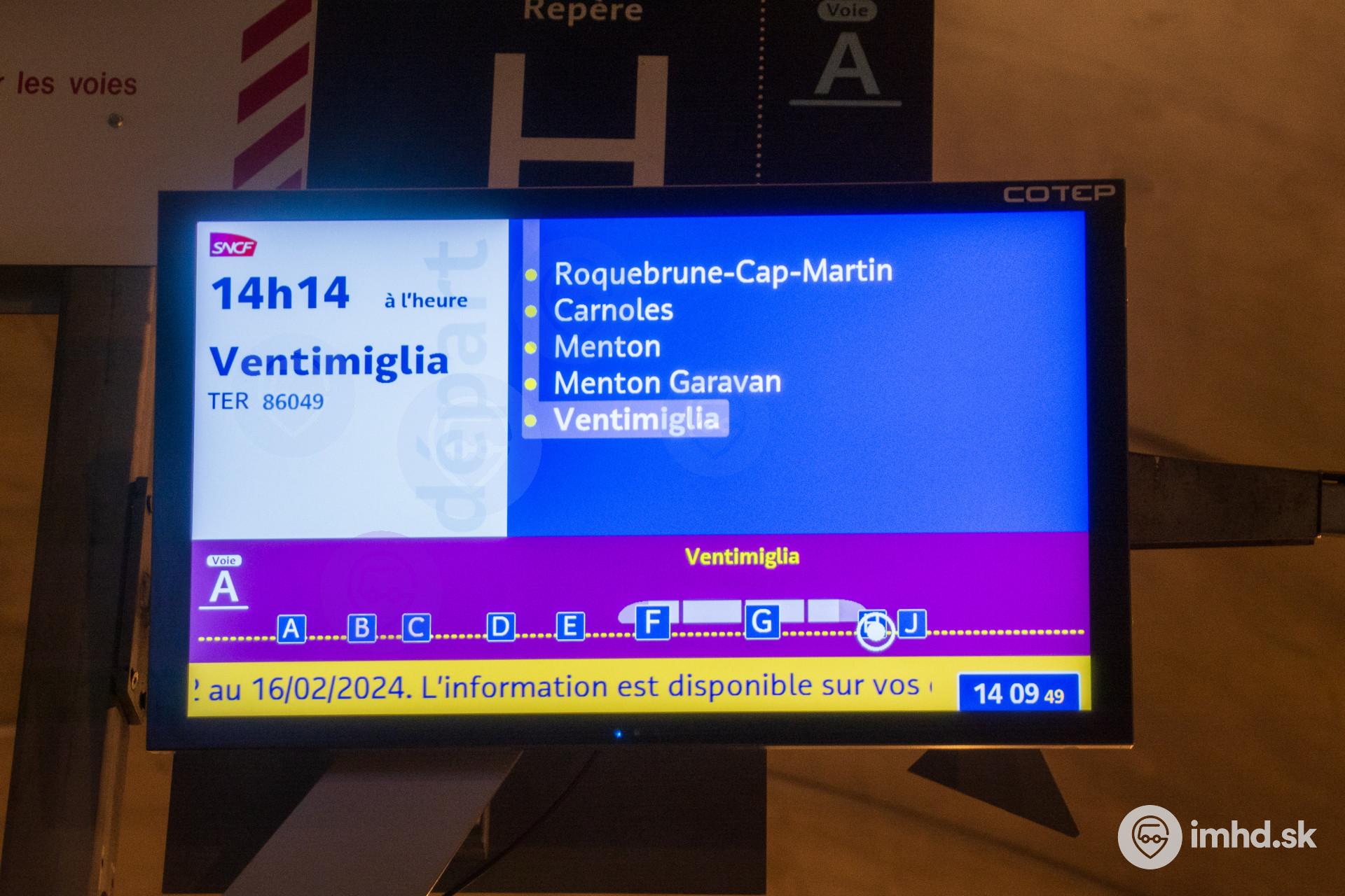 LCD obrazovka na nástupišti v stanici Monaco Monte Carlo. Obrazovka zobrazuje trasu vlaku, čas odchodu vlaku, ako aj sektory, v ktorom súprava zastaví.