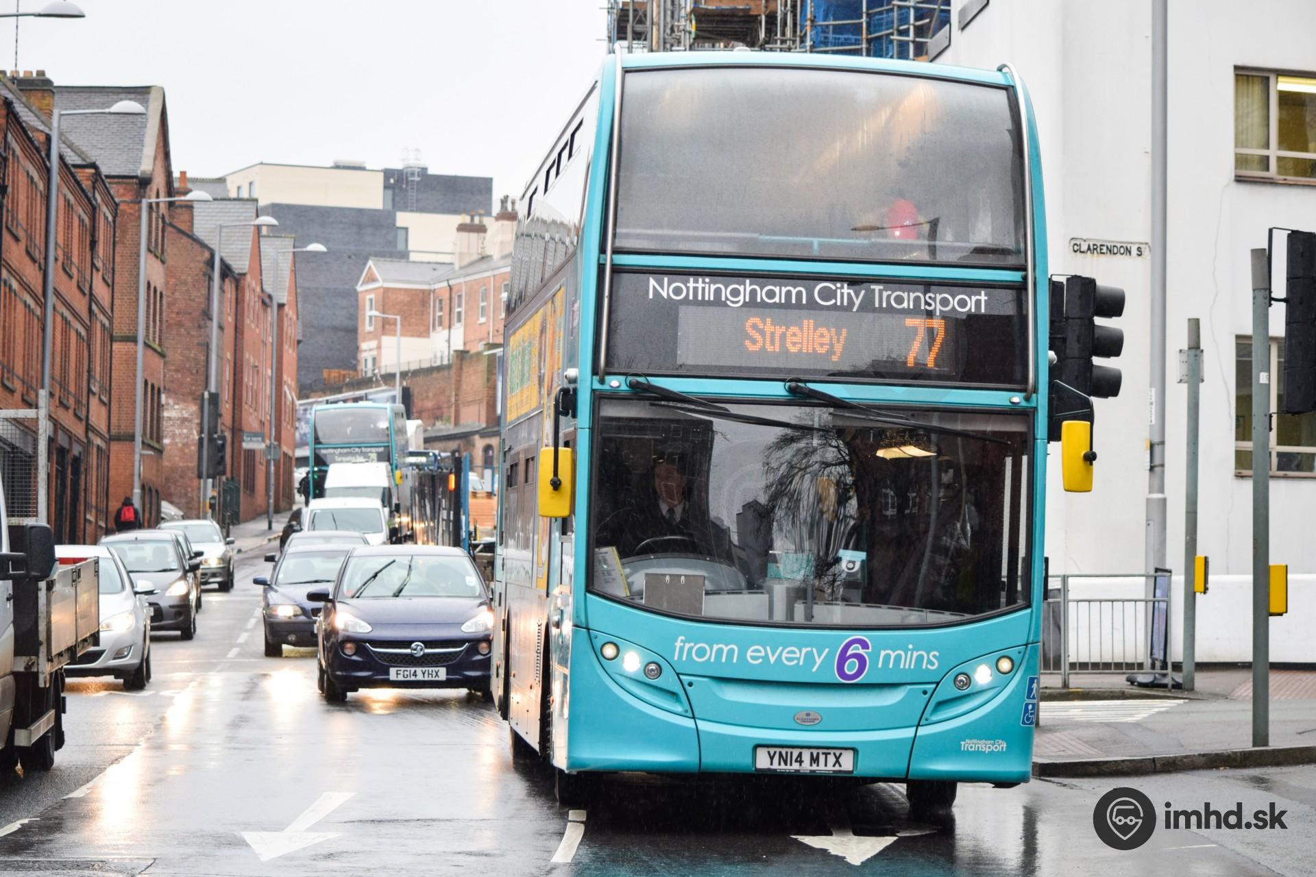 ADL Scania Enviro 400 na linke 77, ktorá bola o 7 mesiacov neskôr pomenovaná po boxerovi z Nottinghamu - Wally Swift