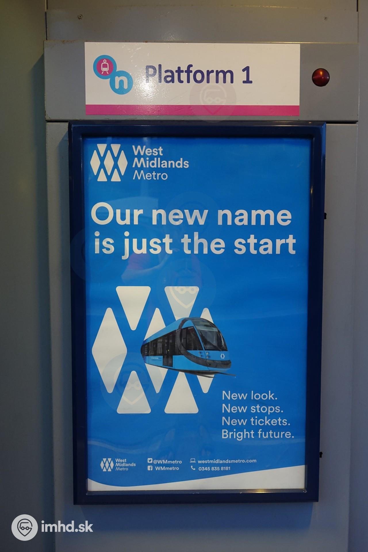 Označenie nástupišťa ešte v starom dizajne Midland Metro a pod ním reklama na rebranding na West Midlands Metro.