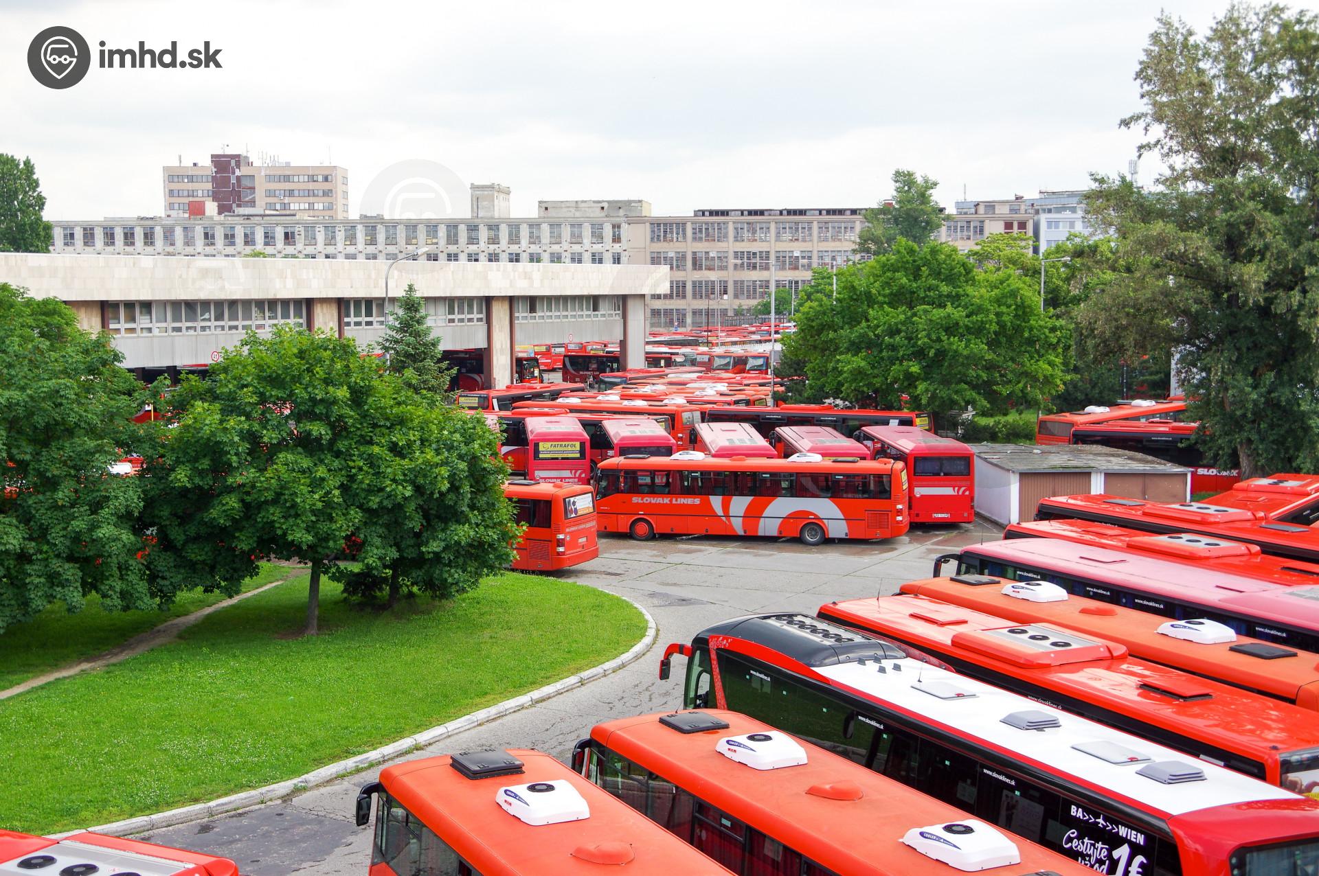 Autobusová stanica Mlynské nivy plná červených autobusov Slovak Lines.