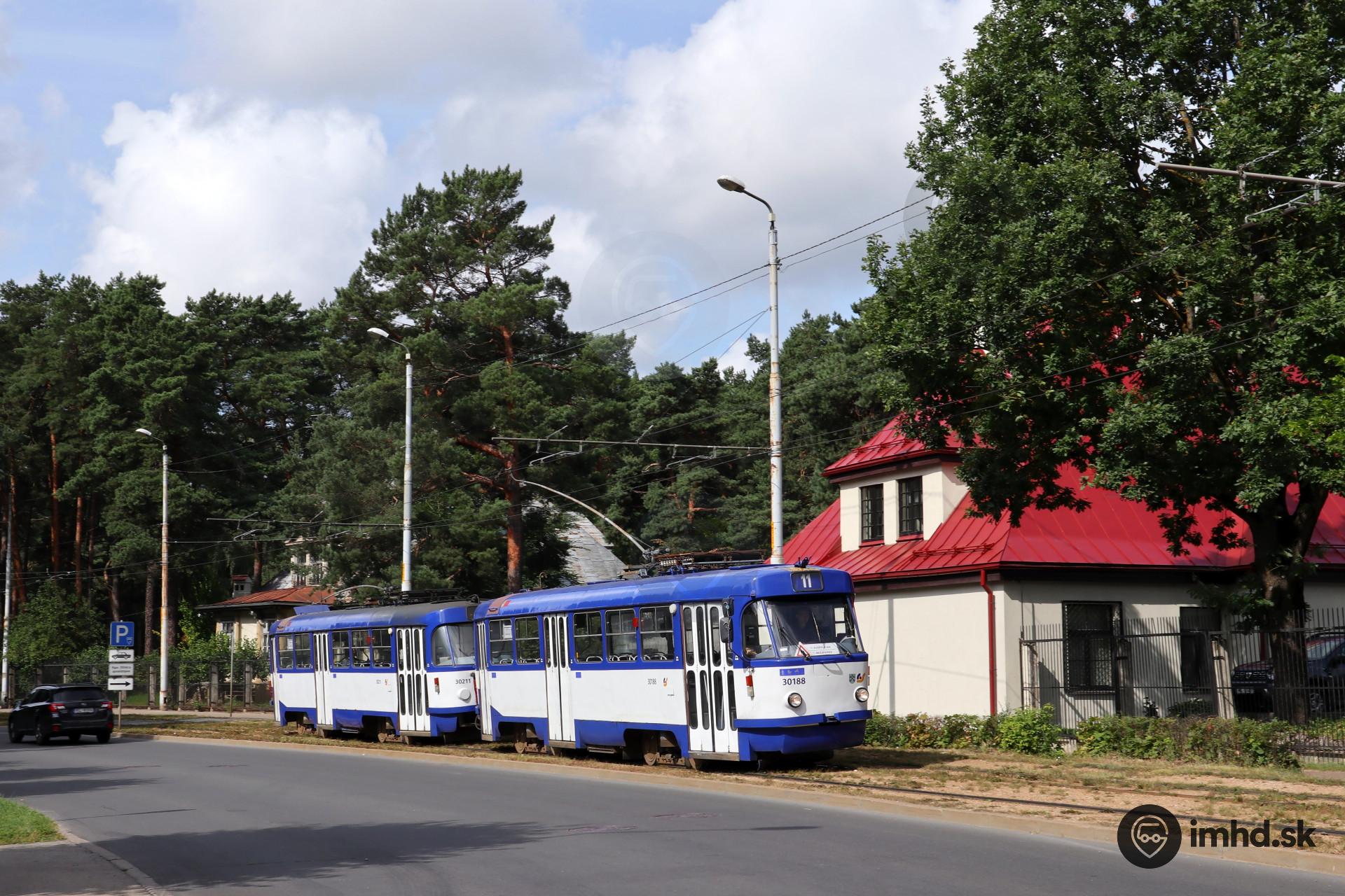 Súprava T3A #30188+30211 s vodičom v zácviku prichádza ku konečnej zastávke linky 11.