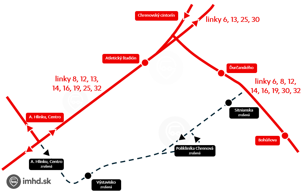 Obojsmerne cez zastávku Atletický štadión (okrem zrušených zastávok vynecháva aj zastávku Ďurčanského).