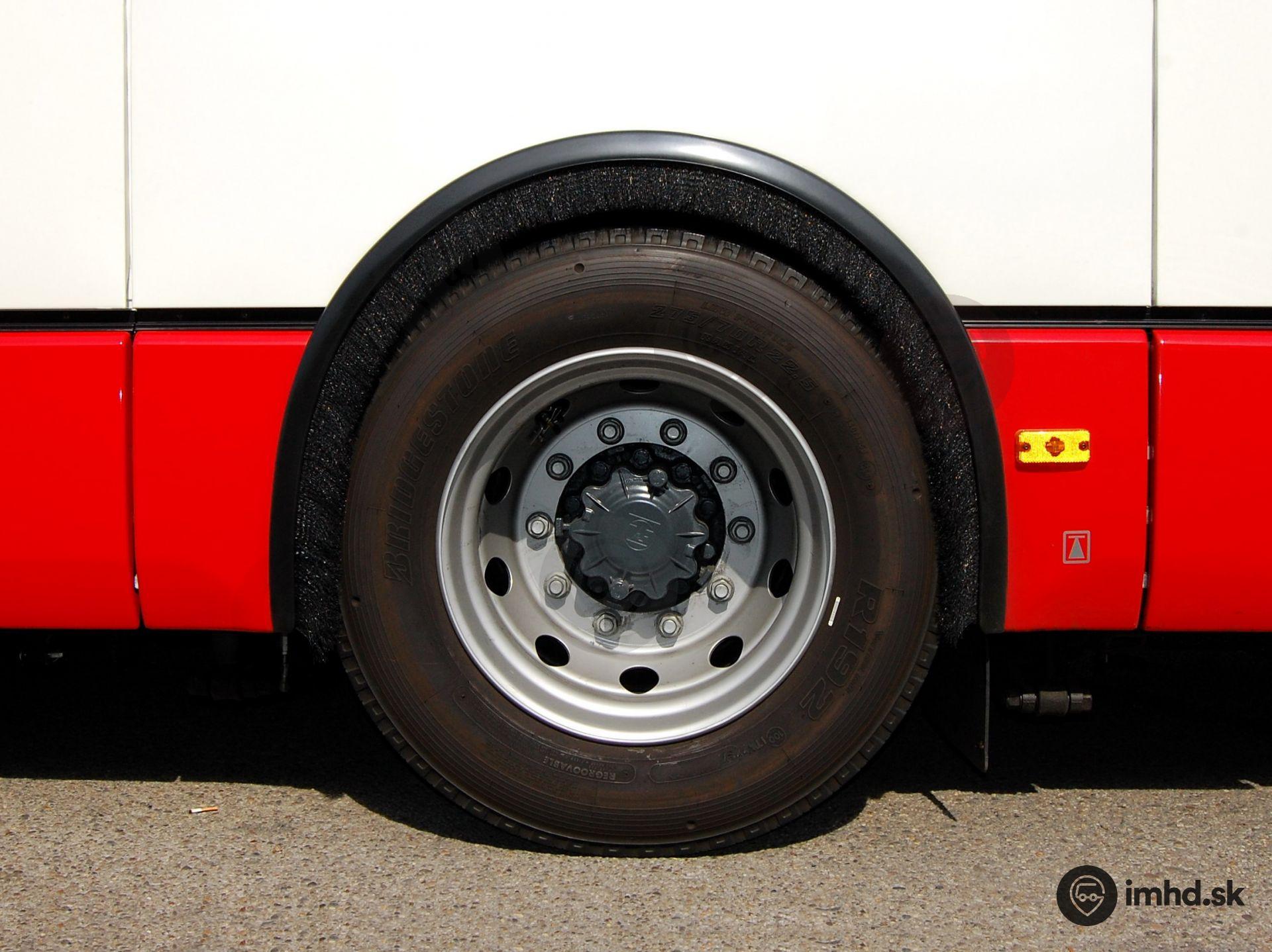 Druhá náprava brnianskeho Irisbusu Citelis 18 M so štetinkami okolo kolesa zabraňujúcimi znečisťovaniu vozidla.