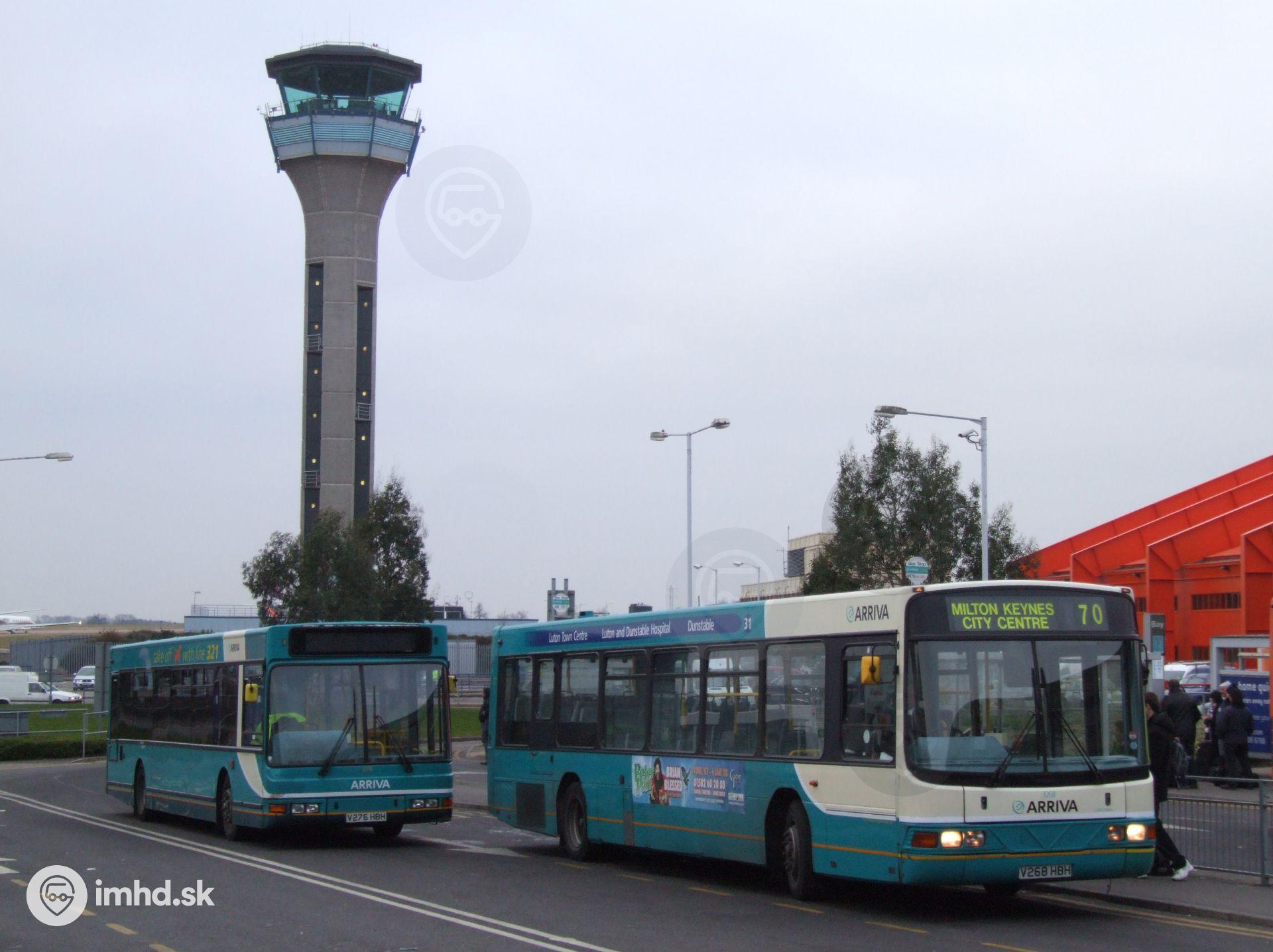 Volvo B10BLE / Wright Renown #3268 a DAF DE02GSSB220 / Plaxton Prestige #3276 čakajú na autobusovom termináli letiska Luton.