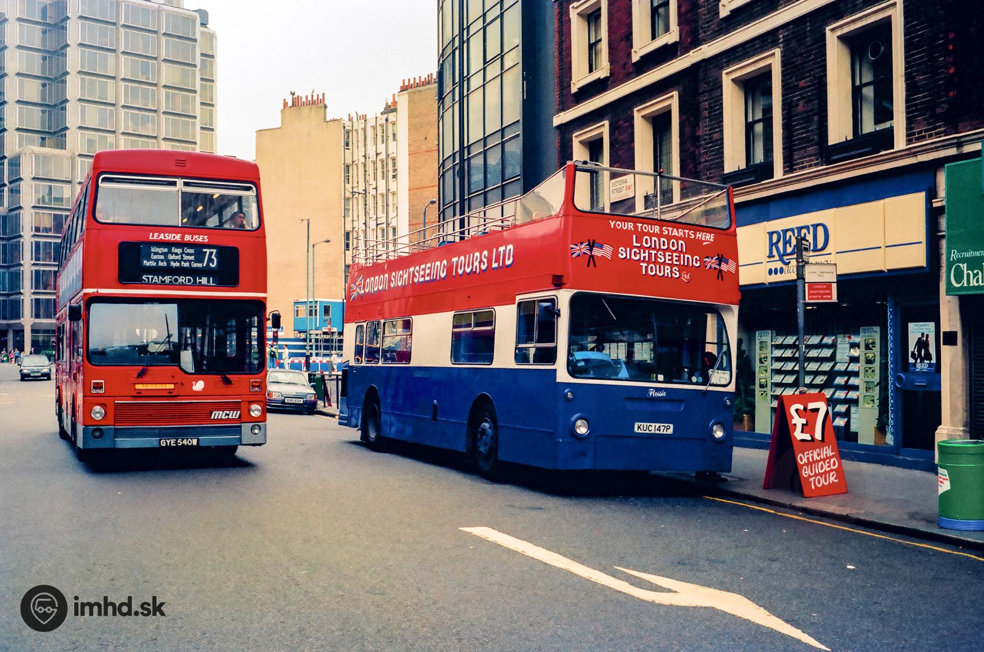 Vyhliadkový autobus Daimler Fleetline / Park Royal a MCW Metrobus na linke 73 na Victoria Street