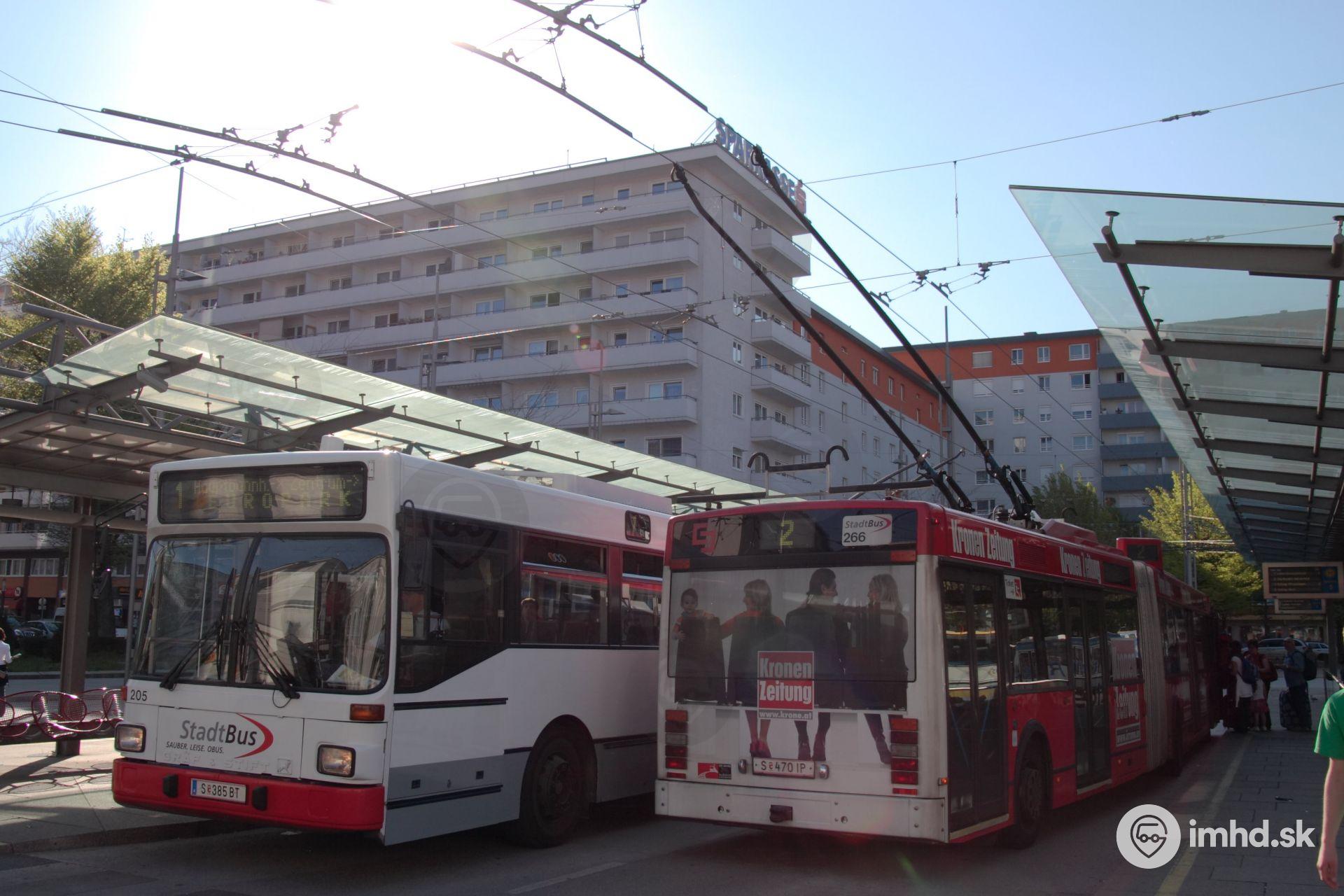 Gräf & Stift GE 112 M16 #205 a Van Hool AG300T #266 v prestupnom termináli na železničnej stanici.
