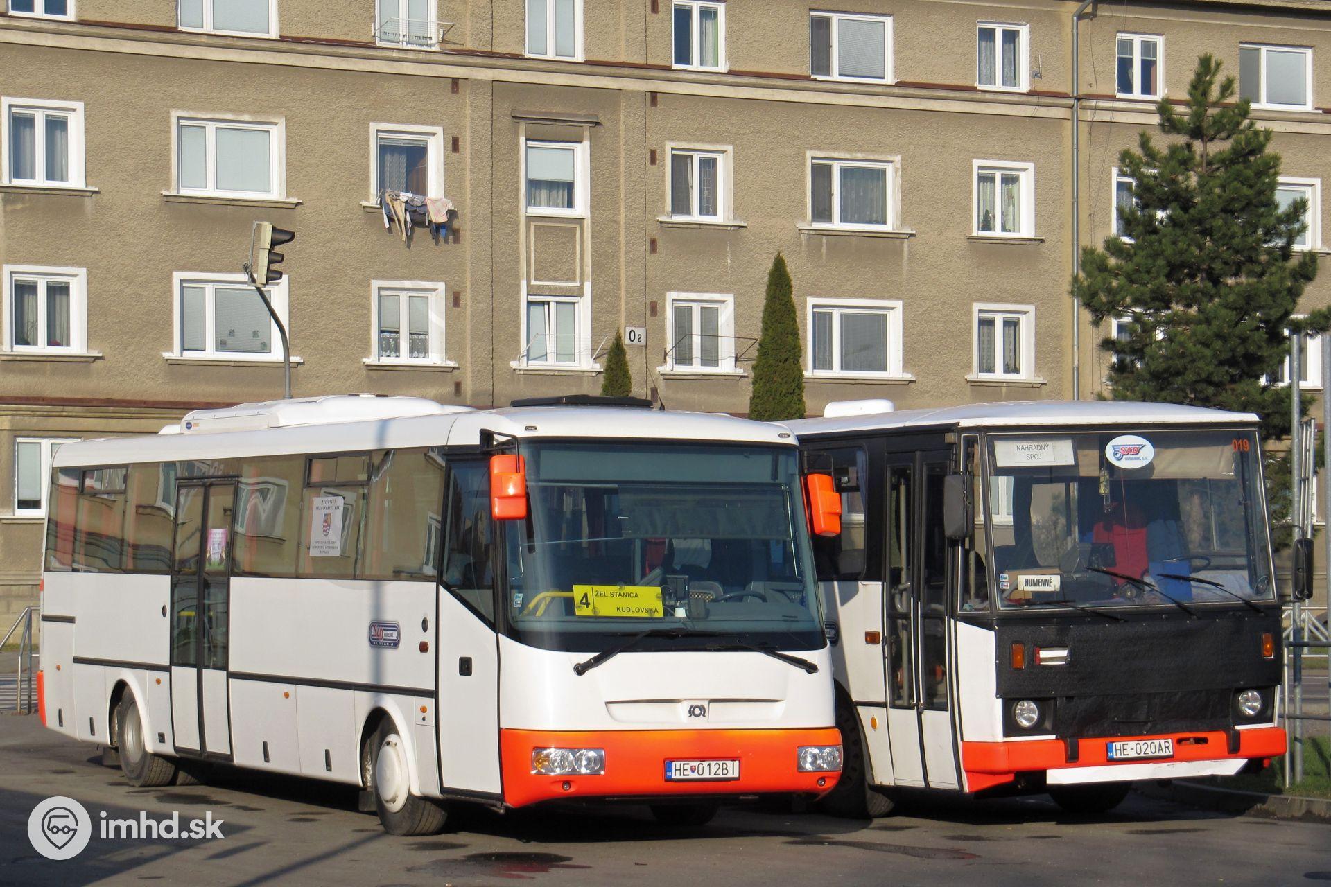 SOR C 10,5 #HE-012BI pripravená vyraziť na spoj linky 2 (i keď podľa tabule by mala ísť na linku 4...) vedľa stojacej Karosy C 734 #HE-020AR služiacej ako záložné vozidlo.