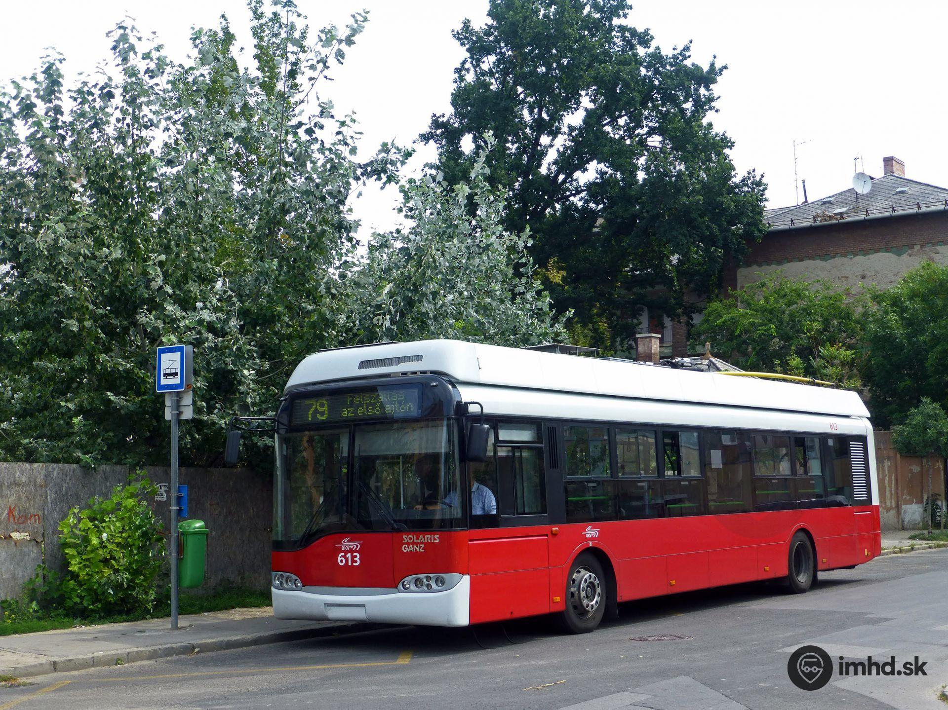 Trolejbus Ganz-Škoda-Solaris Trolino 12B #613 na zastávke Kárpát utca - posledné dve zastávky linky 79 na Révész utca obsluhuje linka iba jednosmerne, v tomto úseku dlhom 750 metrov nie je trolejové vedenie, linku preto obsluhujú duobusy.