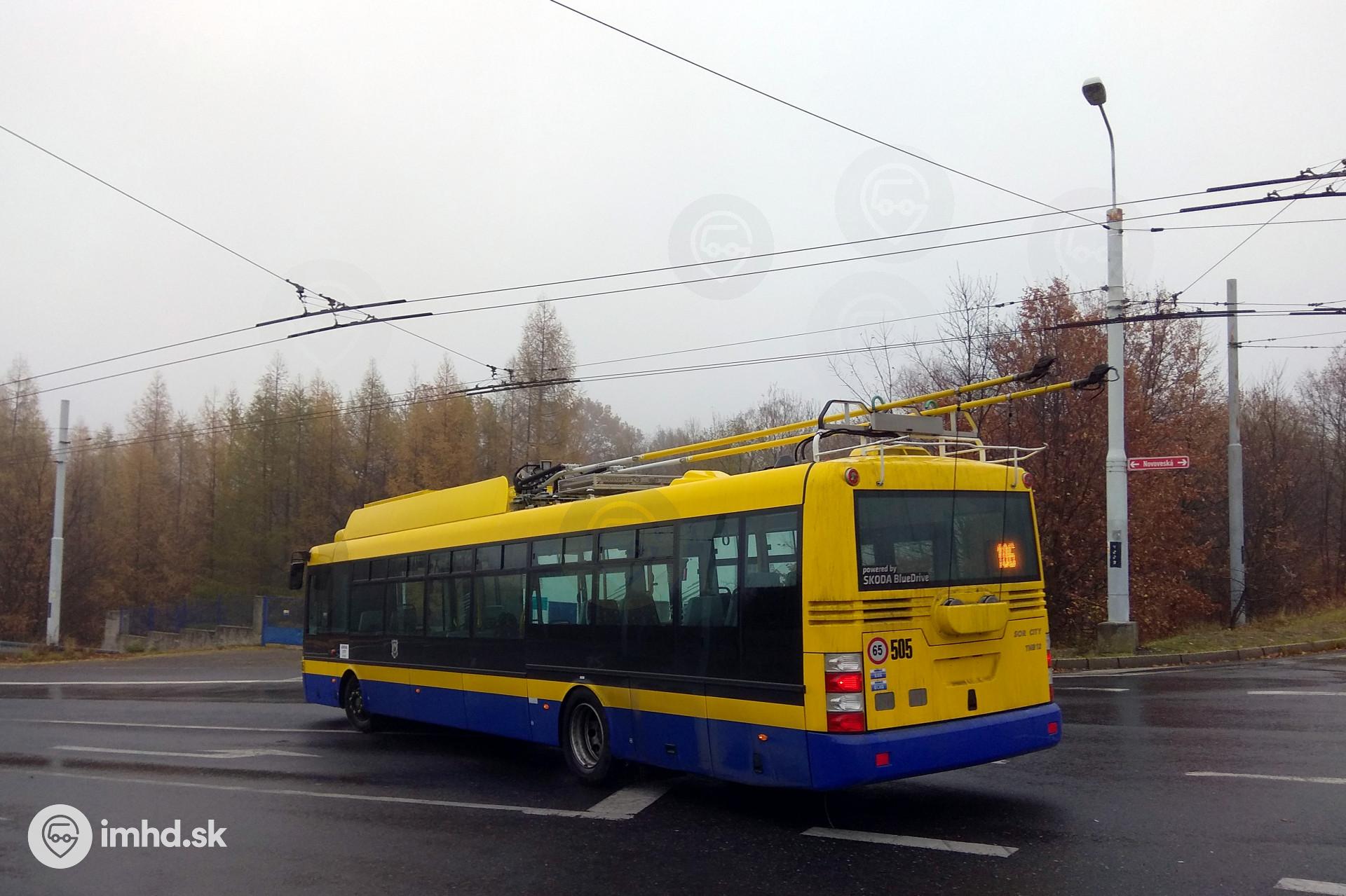 Baterkový trolejbus po krátkej zachádzke mimo trolejového vedenia.