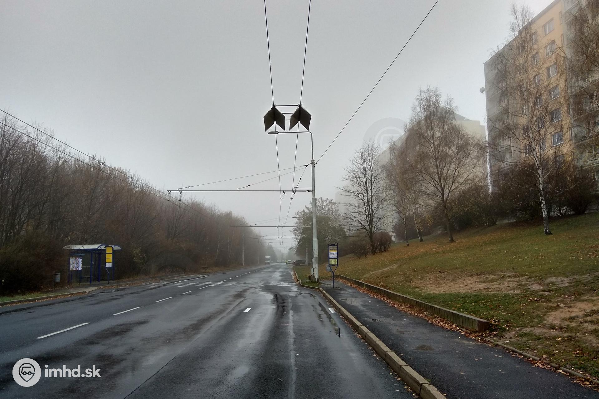 Pohľad na zastávku Topolová smerom k Novej Vsi. Natrolejovaciu striešku využíva linka 106, ktorá má krátku zachádzku k domovu dôchodcov pri zastávke Novoveská.