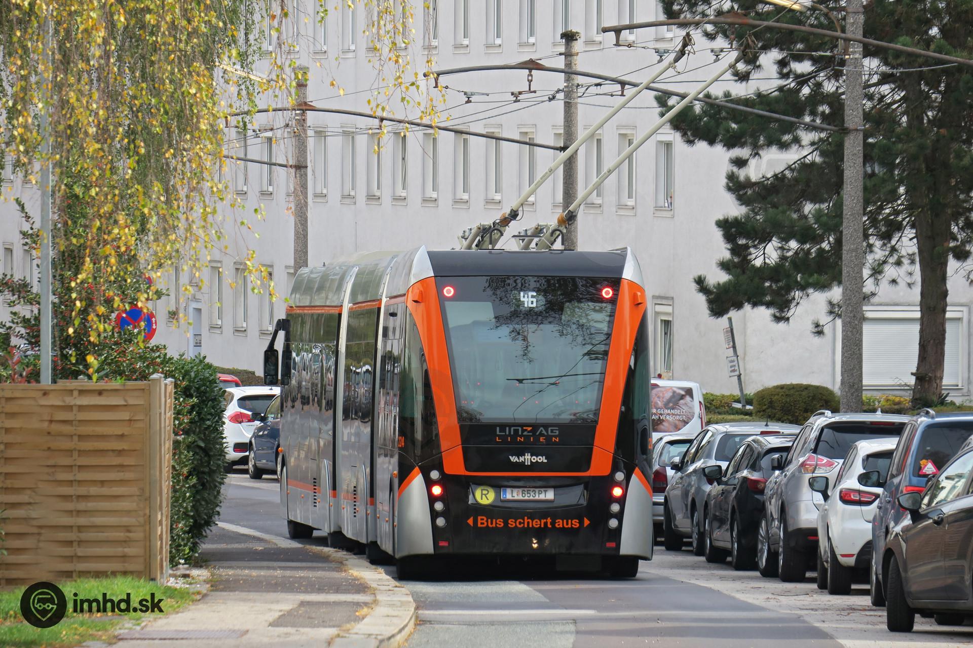 Trolejbus Van Hool Exqui.City 24T #224 schádza z kopca Froschberg.
