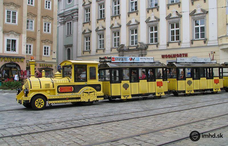 Vyhliadkový autíčko-vláčik premávajúci v centre Linzu.