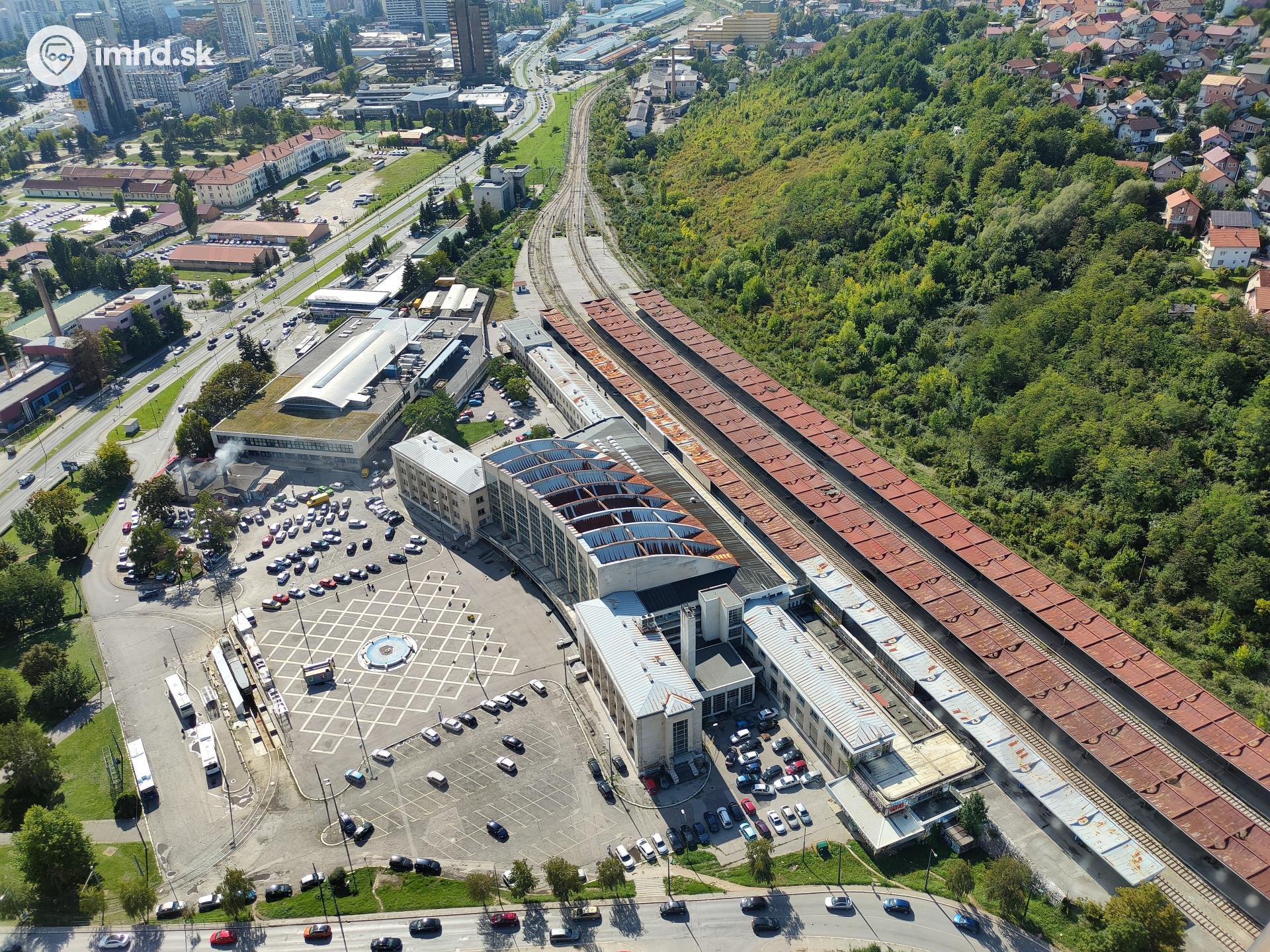 Pohľad na železničnú stanicu a jej okolie z vyhliadky na mrakodrape. Naľavo je možné vidieť improvizované dielne a montážnu jamu pre údržbu električiek.