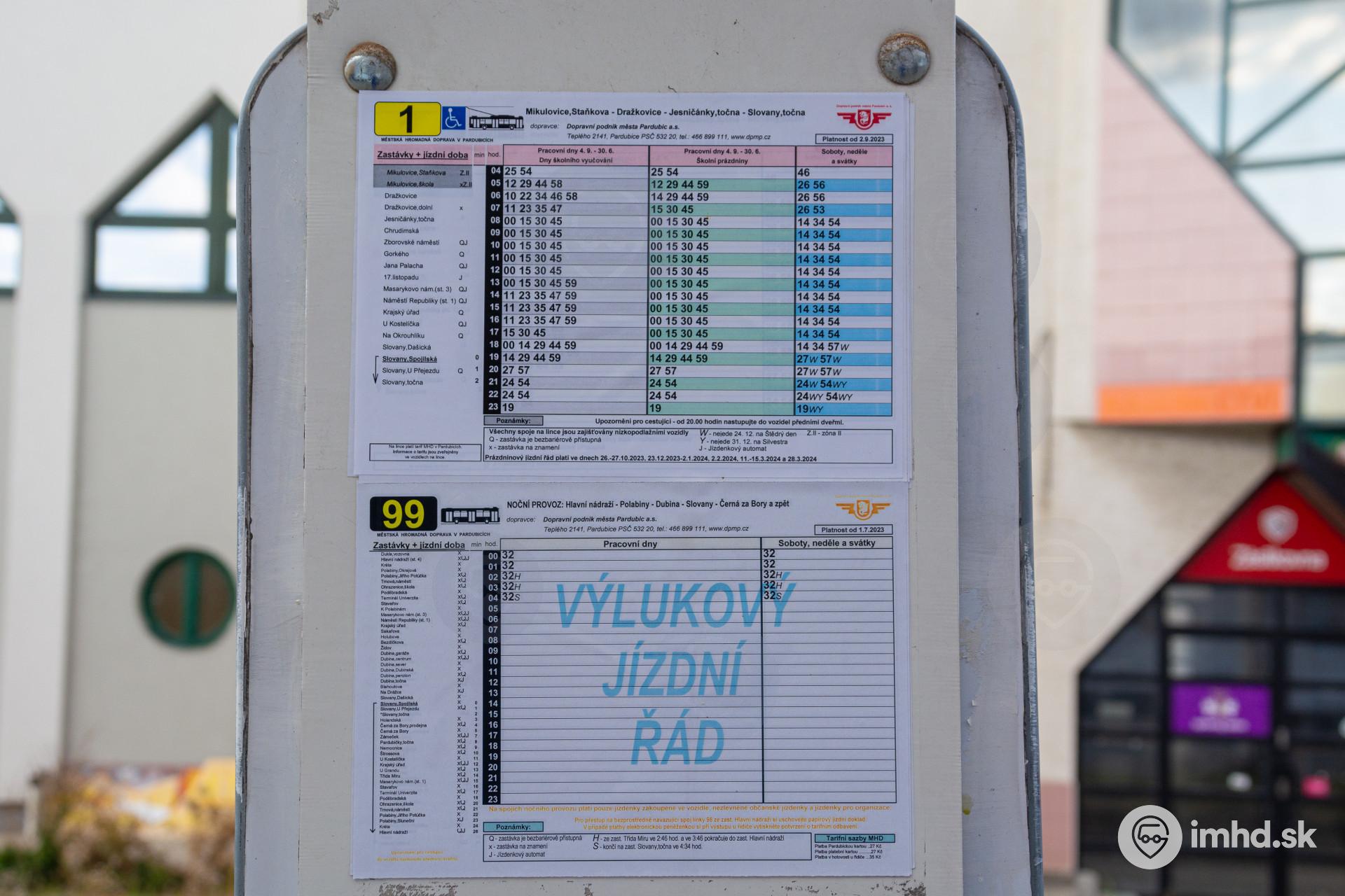 Cestovný poriadok linky 1 a výlukový cestovný poriadok nočnej linky 99.