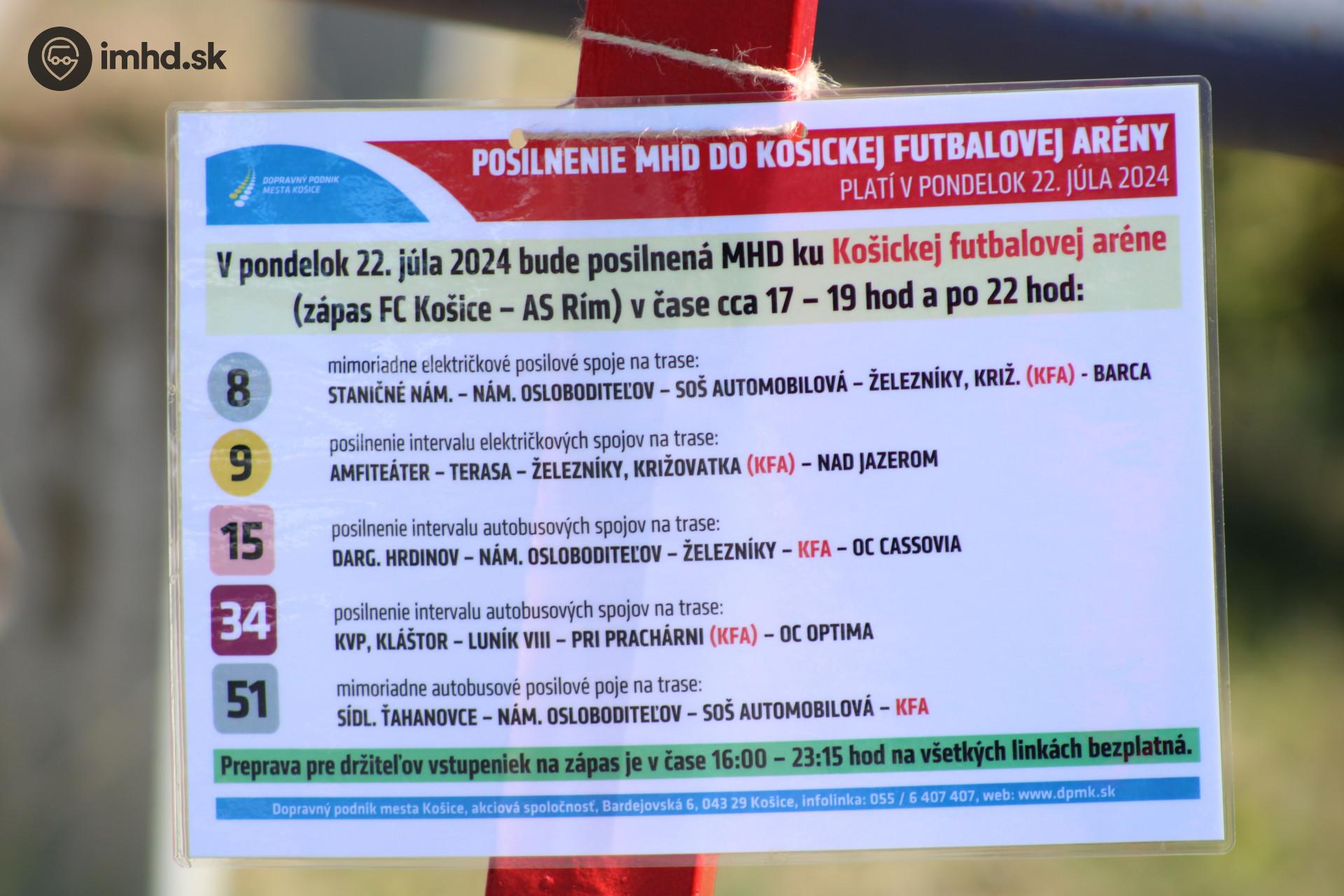 Oznam o posilovej doprave k priateľskému zápasu FC Košice - AS Rím.