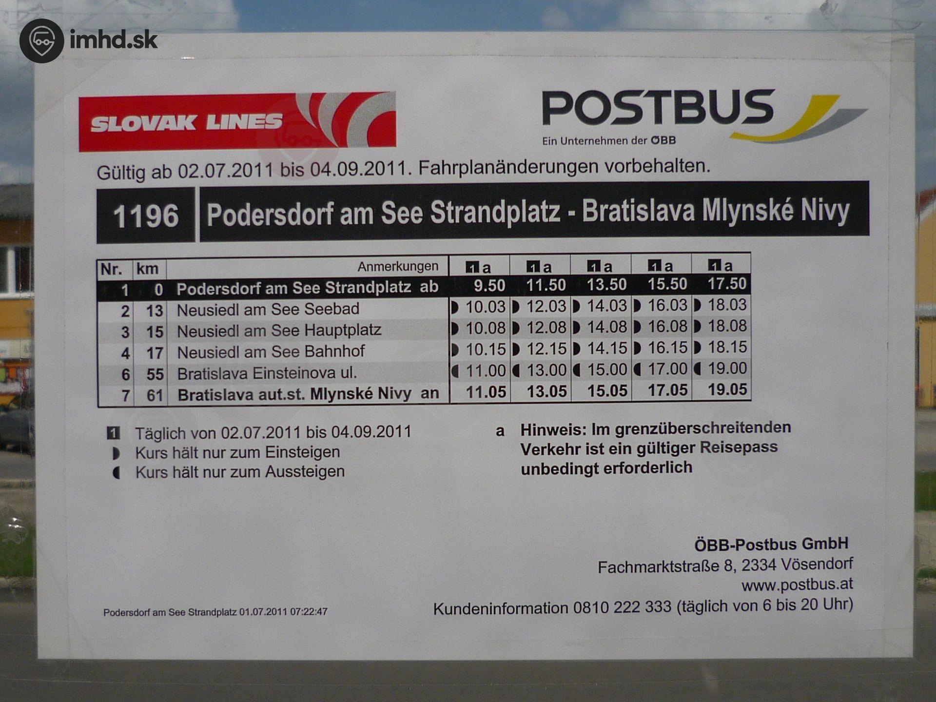 Cestovný poriadok linky 1196 na konečnej zástavke v Podersdorfe.