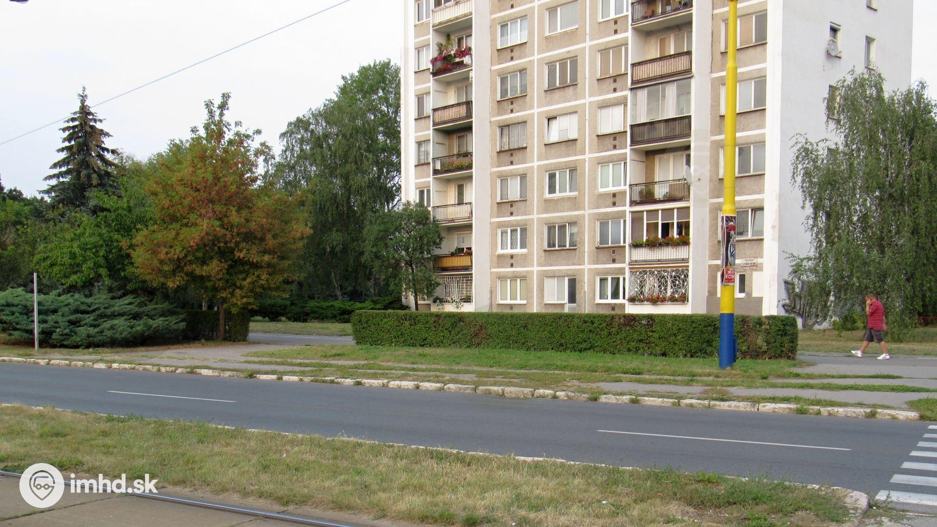 Jemne zarastená zastávka Kino Družba pre náhradnú dopravu
