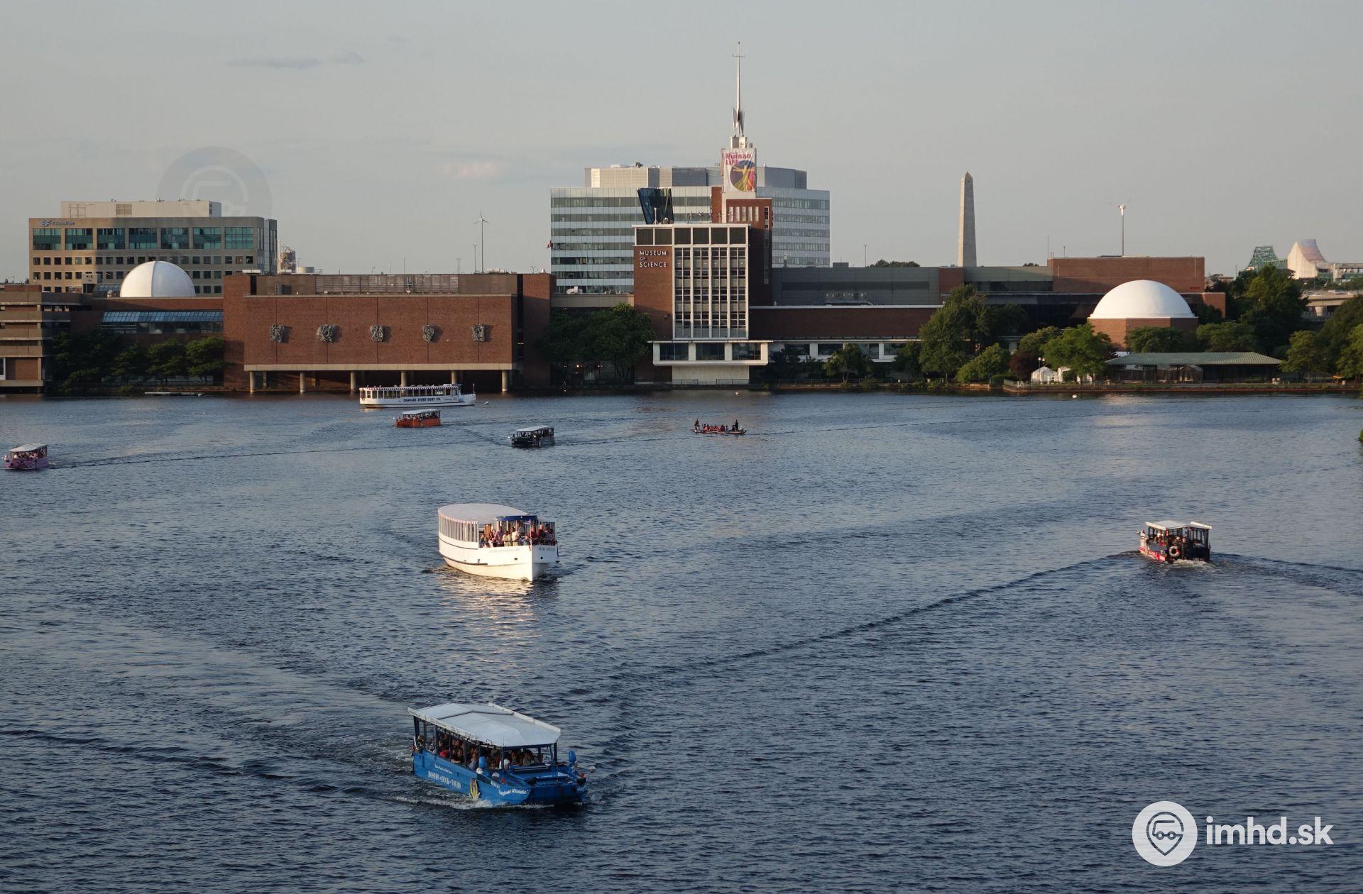 Na vodnej nádrži vytvorenej prehradením rieky Charles (v pozadí) je čulá osobná doprava, ide však o turistickú a rekreačnú prevádzku