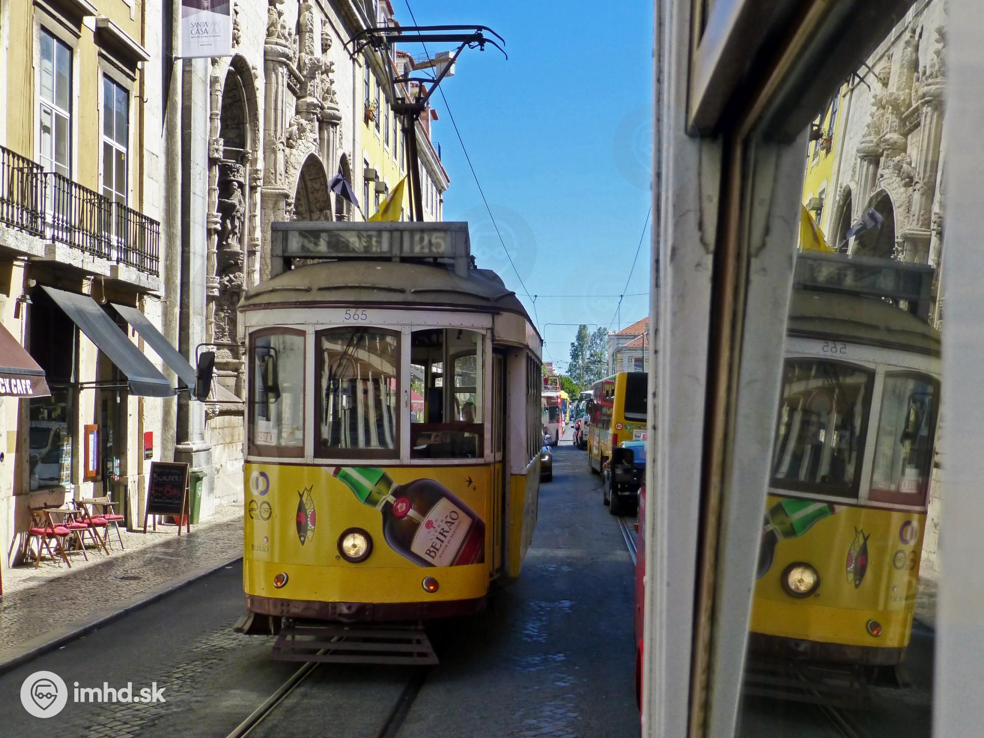 Míňajúce sa električky Remodelado linky 25 na Rua da Alfândega.