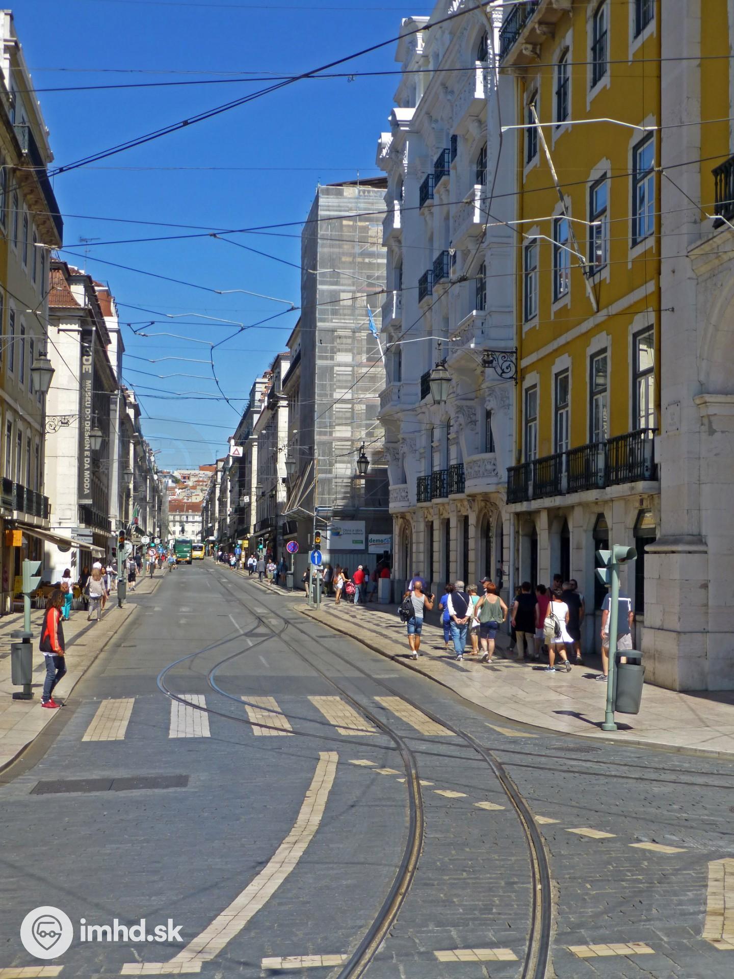 Pohľad od Praça do Comércio do ulice Rua da Prata - zaujme riešenie odbočenia električkovej trate aj použitie svetlých dlažobných kociek ako vodorovného dopravného značenia.