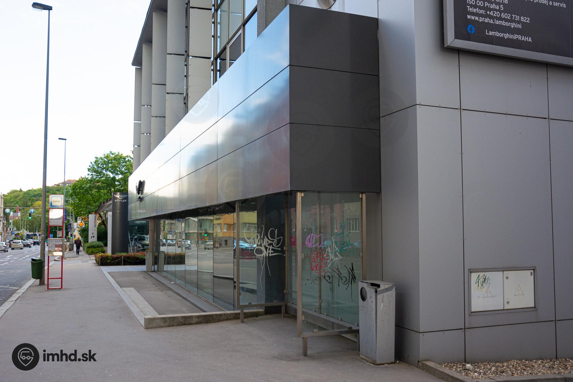 Prístrešok autobusovej zastávky Klamovka je integrovaný do budovy predajne automobilov.