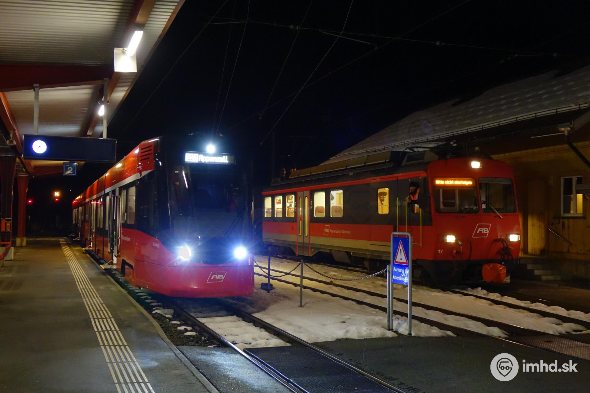 Stadler Tango Be 4/6+ABe 4/6 #4001+4101 v spoločnosti vlaku vedeného vozňom SWA/SLM/ABB BDeh 4/4 #17 v prestupnej stanici Gais.